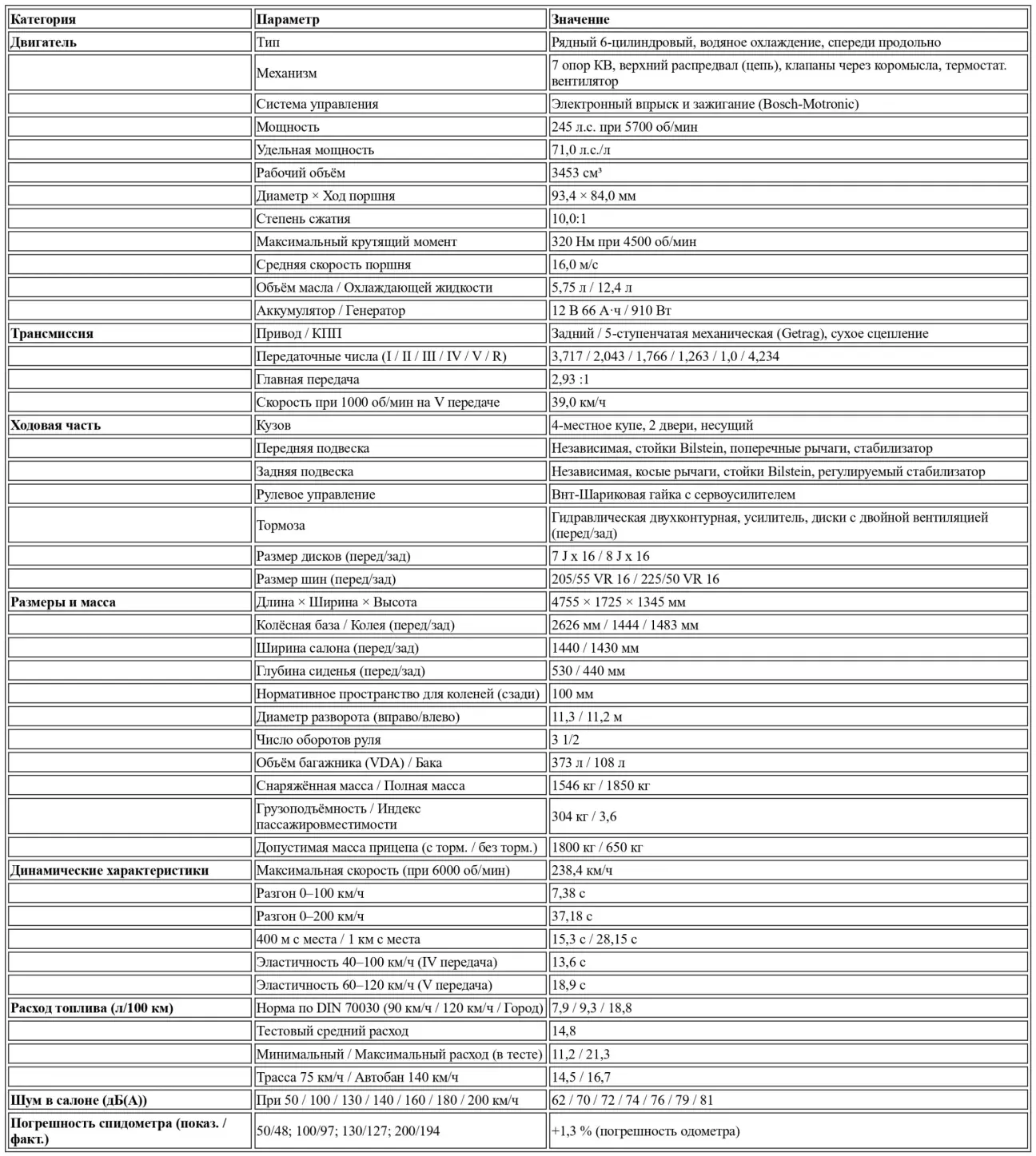 Тому, что заявленным Бовензипеном показателям мощности можно верить, несмотря на несколько меньшую разгонную динамику на высоких скоростях, подтверждением служит измеренная максимальная скорость: она составила 238,4 км/ч, что почти на десять км/ч выше, чем у серийного автомобиля. Доработка в баварском Бухлоэ не прошла бесследно и для плавности хода, и для расхода бензина. В то время как по первому критерию приходится мириться с небольшими уступками, поскольку доработанный шестицилиндровый двигатель работает уже не так бархатно-мягко, как его серийный аналог, в отношении бензинового аппетита стоит отметить положительные моменты. Двигатель B9 оказался относительно умеренным; он потреблял в среднем 14,8 литра супербензина на 100 км, и это при отчасти неблагоприятных условиях — в холодное время года и частично на «скоростных» зимних шинах.