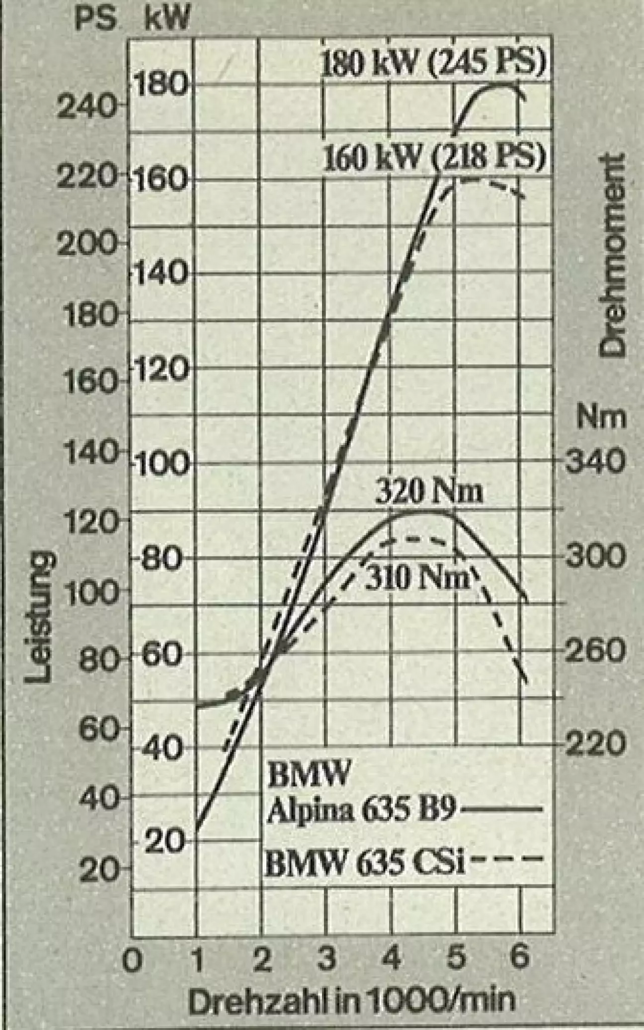 По способности раскручиваться двигатель Alpina, бесспорно, ещё лучше, чем серийный мотор, который уже в этой дисциплине является образцовым. И это отчасти сказывается на динамических характеристиках купе B9. Оно разгоняется с нуля до 100 км/ч за 7,3 секунды и к этому моменту (см. также сравнительную таблицу) имеет преимущество в несколько десятых секунды перед 635 CSi, которое, однако, снова теряет в верхнем скоростном диапазоне до 200 км/ч, что обусловлено несколькими причинами. Во-первых, Alpina-купе имеет немного более длинное передаточное число главной пары (2,93), а во-вторых, оно катится на более широких шинах (205/55 VR 16 спереди и 225/50 VR 16 сзади) и уже по этой причине, а также из-за глубоко опущенного переднего спойлера, имеет большую лобовую площадь, чем серийная BMW 635 CSi.