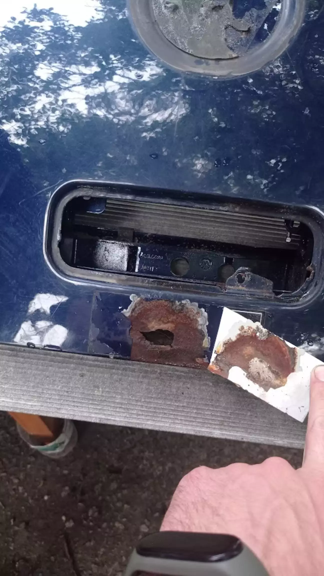 Друга проблема - кришка багажника. Це болячка Гольфів, і мене вона не оминула. Думаю, дуже багато власників Четвертого покоління стикалися з цією проблемою. Так, під ручкою відкривання іржа та гниль. При покупці авто проблему бачив, було лише вздуття фарби. Але з часом з'явилася сквозна дірка((( Відновлювати рідну кришку немає сенсу, так як всередині на стику багато іржі, яка через деякий час полізе назовні. Тому було прийняте рішення по заміні кришки. Почав шукати кришку на розборках, але а гарному стані знайти дуже важко. Пошуки тривали майже два місяці, але все таки я знайшов кришку в гарному стані. Попутно також була куплена нова ручка відкривання багажника.