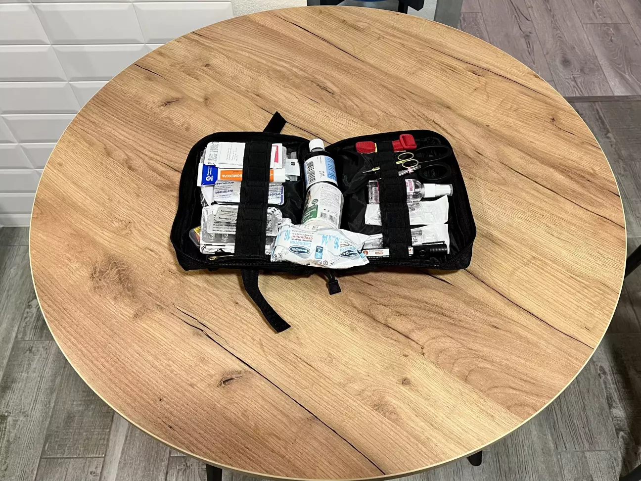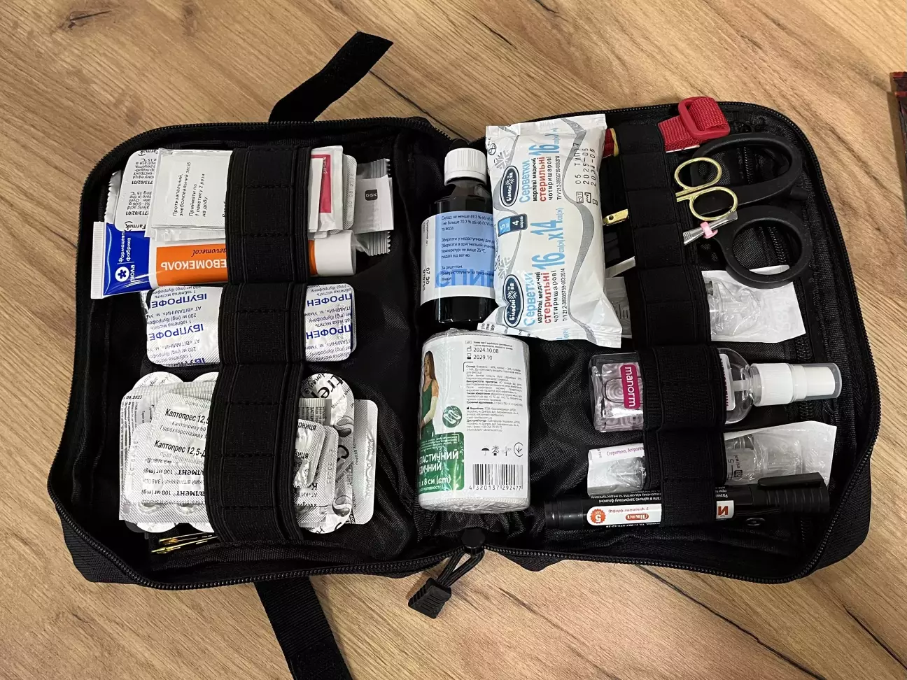 Єдине, не побачив оклюзійну торакальну наліпку. Це для герметизації проникаючих поранень грудної клітки (зламані ребра, які пробили легені, тощо) для запобігання пневмоторексу.