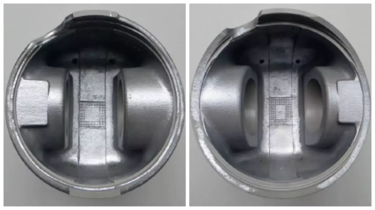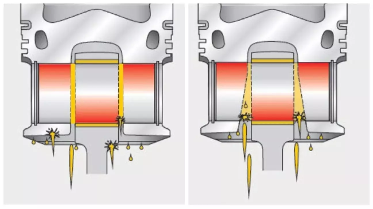 Ліворуч – поршень з паралельною виїмкою для шатуна, праворуч – поршень з трапецієподібною виїмкою для шатуна