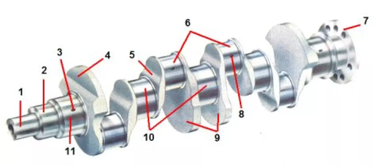 Тут треба повернутися до корінних шийок деталі. Вони вже знаходяться на одній осі й служать для з’єднання колінвала з блоком циліндрів двигуна. У найпростішому варіанті корінних шийок дві — на різних кінцях колінвала. Але зазвичай їх більше, оскільки деталь дуже масивна й високо навантажена.