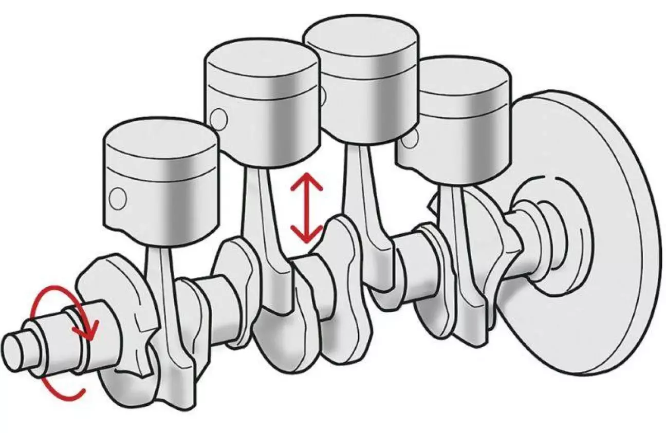 Звісно, у двигуні все набагато складніше. Тут є поршні й шатуни, які кріпляться до них через «пальці» (втулки) верхньою частиною. Шатуни виконують ту саму роль, що велосипедні педалі. Їхня нижня частина з’єднується з шатунними шийками колінвала, зміщення яких і утворює важіль, потрібний для перетворення лінійного руху на обертальний.