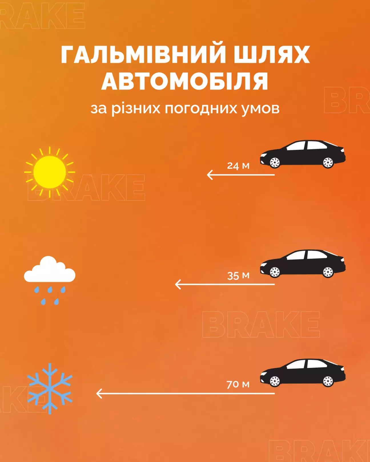 Але ледь не найбільше на нього впливають сезон та погодні умови. Пригадайте, як збільшується гальмівний шлях в холоди, разом з нашою памʼяткою.