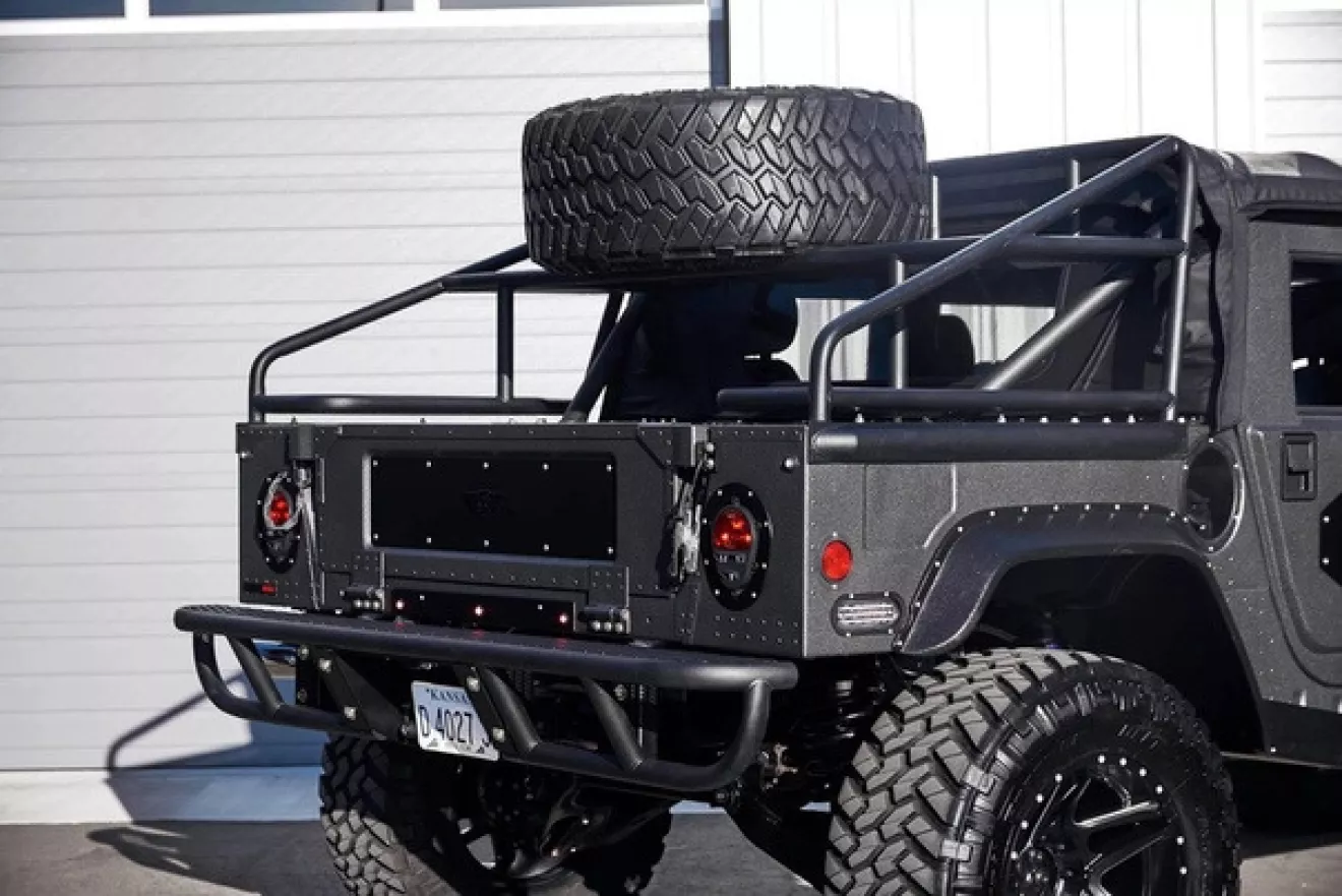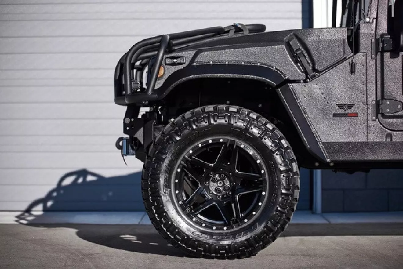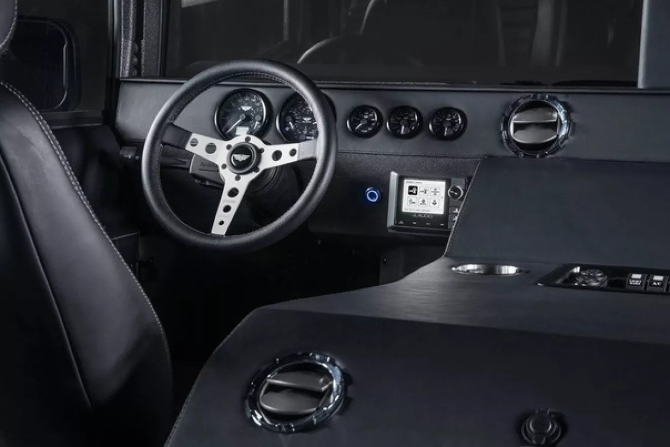 Апгрейды коснулись и корпуса внедорожника: кузов авто получил порошковое покрытие и улучшенную звукоизоляцию, а шасси были практически полностью заменены. Внутри от стандартного салона Mil-Spec не осталось почти ничего: интерьер H1 пополнился алюминием, кожей, водонепроницаемым винилом, четырьмя кастомными сиденьями и рулевым колесом Momo Prototipo. Апгрейды в салоне завершает продвинутая аудиосистема JL, USB-порты для зарядки и светодиодное освещение.