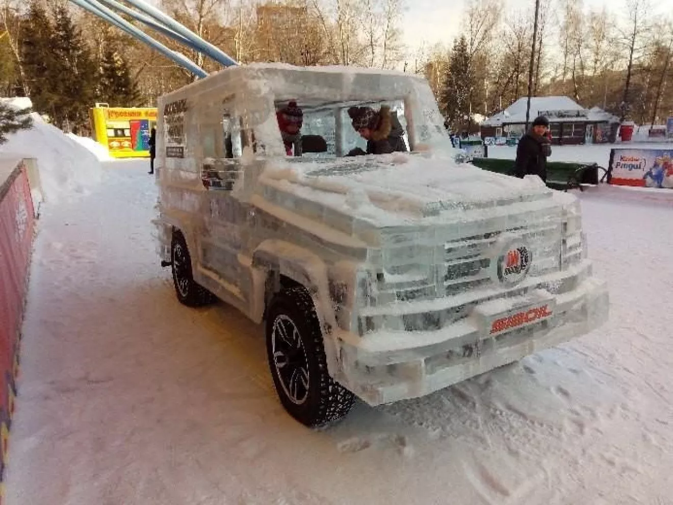 В качестве базы они использовали шасси и двигатель от УАЗа, а кузов был сделан из… 5 тонн льда.Ледяные блоки аккуратно нарезали, подточили, отшлифовали и надели на заранее подготовленный металлический каркас. А чтобы машина выглядела еще ярче, ее снабдили подсветкой.