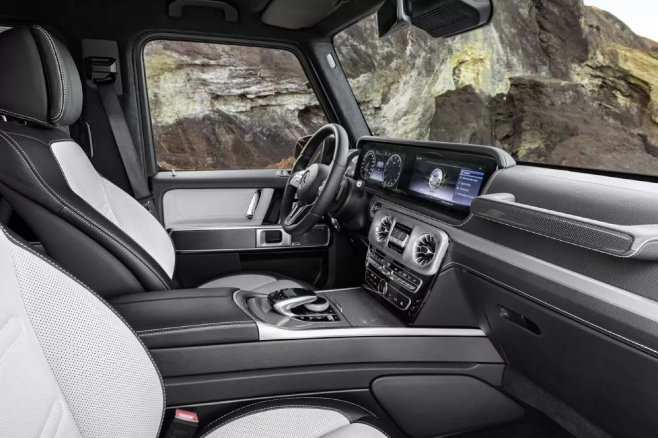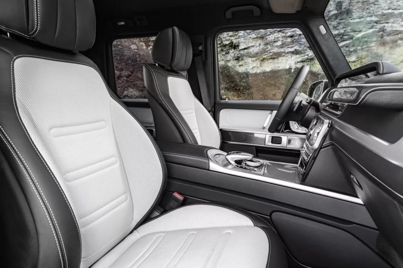 Для нового G-Class предлагается в качестве опции акустическая система Burmester с 16 динамиками, а также пакет Active Multicontour Seat, подразумевающий специальные передние сиденья с функциями обогрева, вентиляции и массажа. Разнообразить интерьер можно будет также благодаря различным цветам кожи (Lugano Black, Nut Brown или Macchiato Beige), пакету Exclusive Interior Plus, который добавляет машине такие вещи, как кожаная обивка Nappa на дверях, центральной консоли и приборной панели или, например, огромному количеству вариантов (более 60) фоновой подсветки.