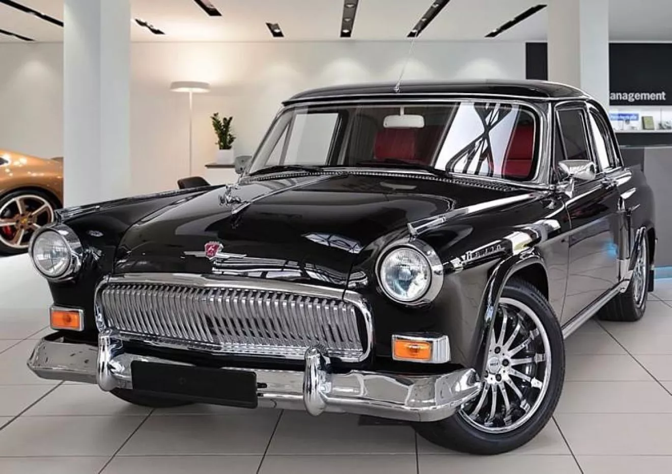 Автомобиль в кузове купе обладает целеустремленным и спортивным дизайном с нотками ретро. У него есть все ключевые атрибуты ГАЗ-21, включая знаменитую фигурку оленя на капоте. В салоне на руле имеется надпись “Волга”.Под капотом авто расположен оригинальный мерседесовский 5,5-литровым агрегатом V12 мощностью 500 л.с. Среди “плюшек” – кожаный интерьер, центральный замок, электрическая регулировка боковых зеркал и сидений с подогревом и передние подушки безопасности.
