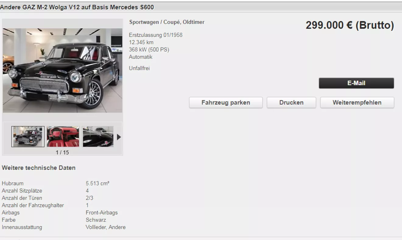 Немецкая компания eTower GmbH, которая находится недалеко от Ганновера, выставила на продажу ГАЗ-21 Волга. Ценник баснословный – за машину просят 299 тыс. евро. Однако это совсем не простой ГАЗ-21, поскольку это вообще… не Волга. По сути, это Mercedes S600 W140 с “винтажной облицовкой”.