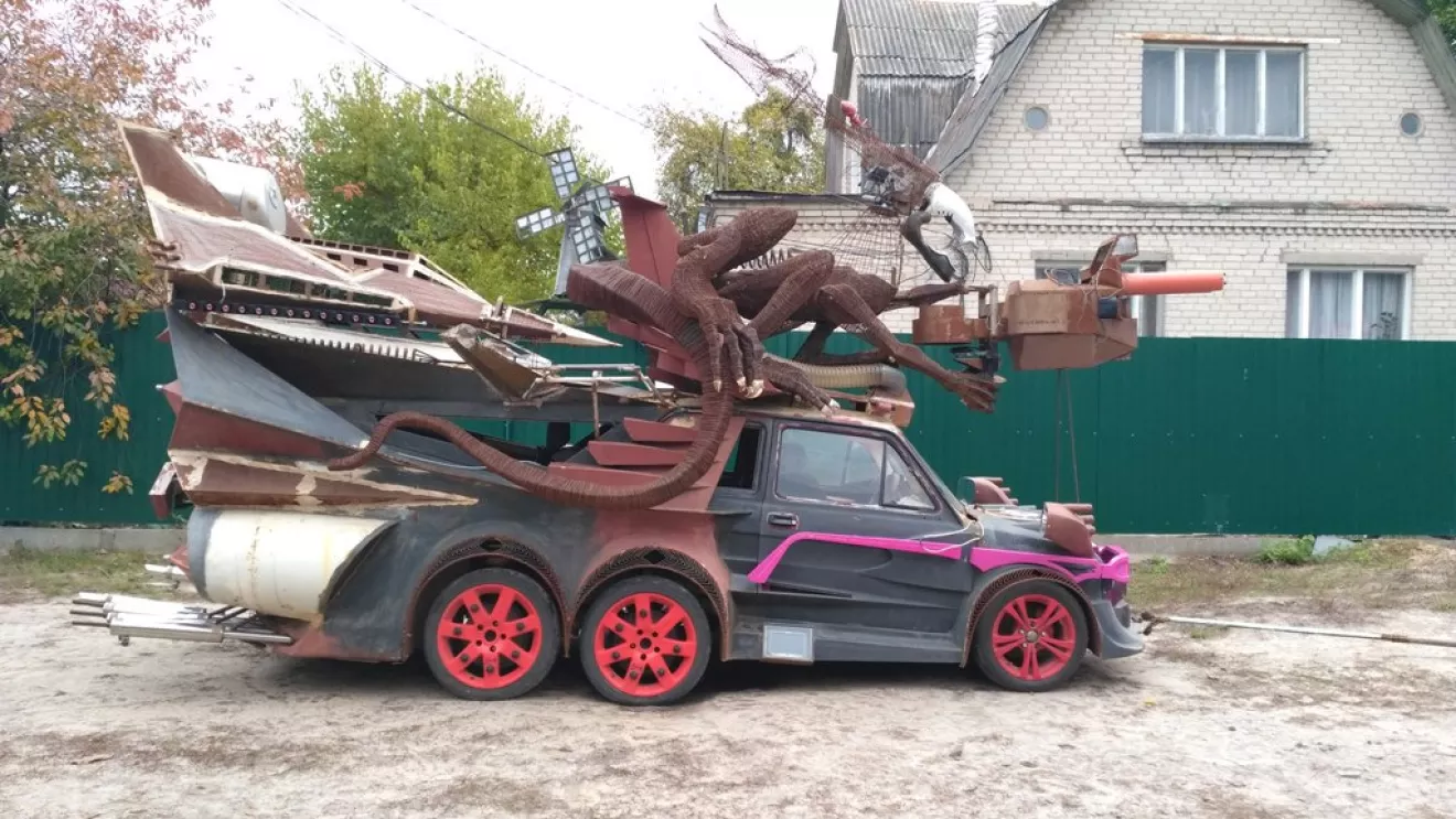 6-колесный автомобиль заимствовал кузов от старого Fiat 126. В качестве силовой установки задействован мотор BMW. На крыше машины «сидит» монстроподобное существо с лазерной пушкой, а на передке можно увидеть розовые очки.Сзади – подобие истребителя, турбины и 8 выхлопных труб. Пожалуй, это самый необычный и жуткий самодельный автомобиль в Украине.