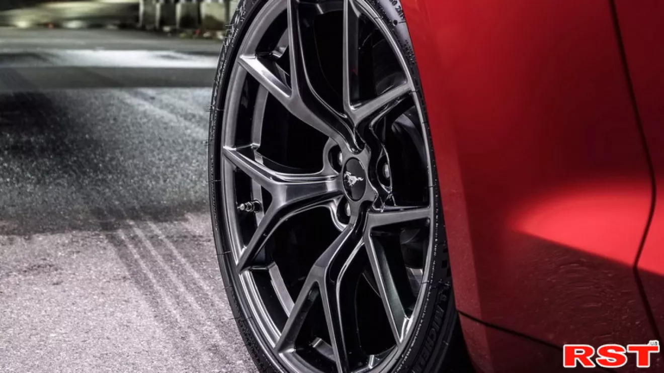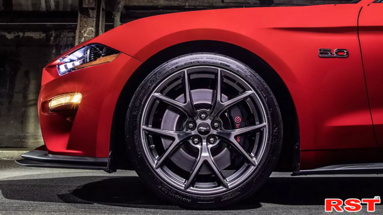 Также для автомобиля были изготовлены уникальные 19-дюймовые колесные диски (19x10,5 передние и 19x11 задние), «обутые» в шины Michelin Pilot Sport Cup 2 (305/30 R19). «Катки» также отличаются от стандартного Performance Pack Level 1 – она почти на 40 мм шире (на 1,5 дюйма). Вместе с перенастроенной подвеской и новыми колесами Mustang на 13 мм ближе к дороге.
