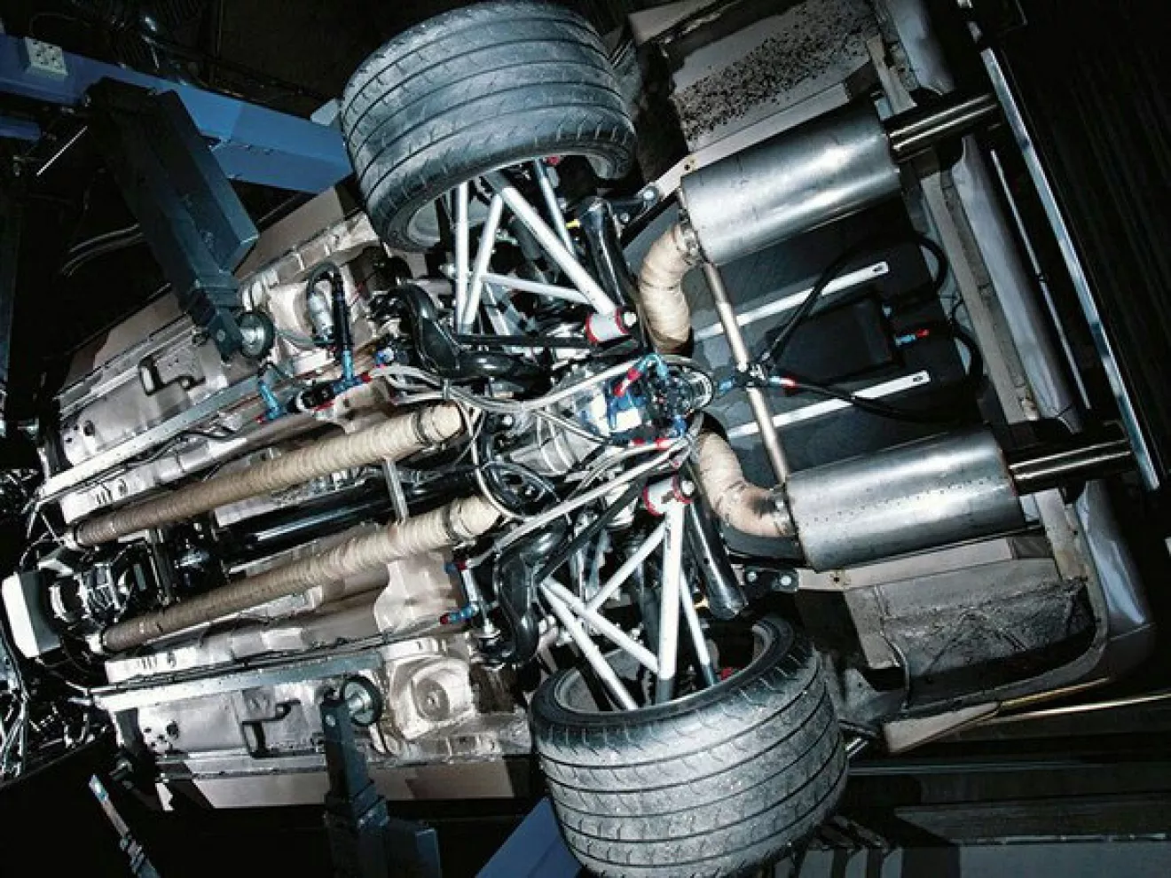 По шасси Джо изначально хотел все построить на пространственной трубчатой раме с сохранением точек крепления подвески. Вообще трубчатый каркас помогает подтянуть подвеску. Затем Джо прикинул, что передняя подвеска от GT40, а задняя от Mustang Cobra R дадут оптимальный баланс и отличную управляемость. Он добавил дополнительные рычаги и стабилизаторы поперечной устойчивости, адаптировав ее под трек. Безумная история получилась с тормозами, которые Джо собрал использовав механизмы Porsche, Mersedes и Mustang. После того, как стал понятен окончательный вес машины и позиции тормозов, был спроектирован педальный узел и главный тормозной цилиндр под ее характеристики.