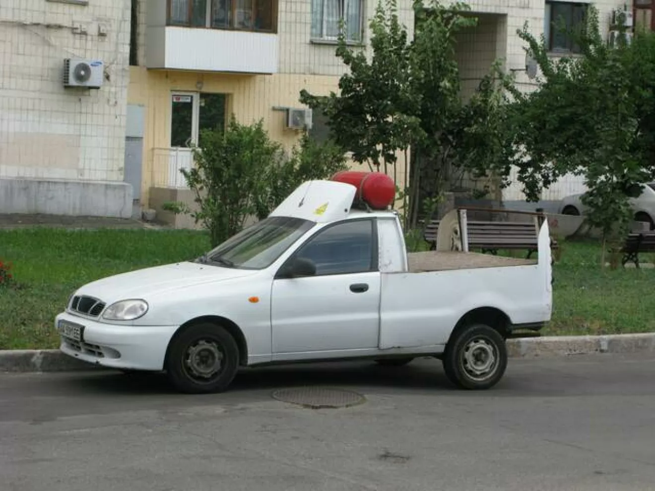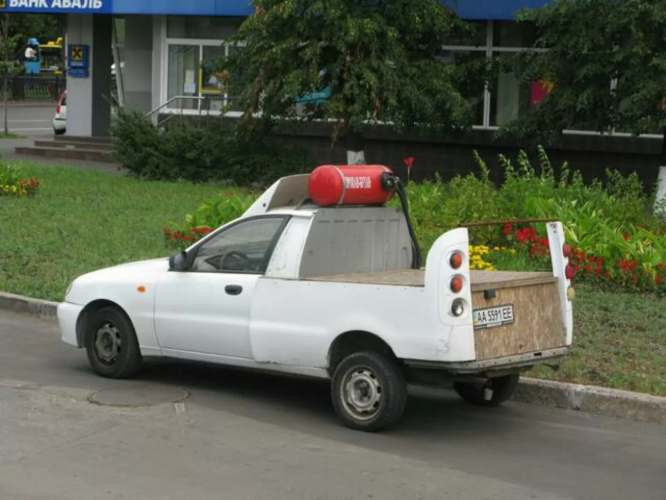 Чего только не увидишь на отечественных дорогах – даже такой народный автомобиль как ЗАЗ Lanos с открытым сзади кузовом.Долгое время в модельном ряду ЗАЗ коммерческие автомобили назывались Pick-up – будь-то Таврия или Ланос, хотя имели закрытый сзади кузов. Грузовая Таврия, правда, поначалу предлагалась с открытой платформой сзади, хотя потом ее оснастили стеклопластиковой надстройкой.Правда, последнюю, если очень надо, можно было снять в условиях гаража за 2 – 3 часа. Что же касается Lanos Pick-up (cегодня машина называется Lanos Cargo), то из него классический пикап никак не получалось сделать.И вот один умелец решил своими силами срезать надстройку на Lanos Pick-up. В общем получился классический пикап, если на считать высоко торчащие задние светоблоки. Для повышения жесткости такого вот кузова было решено соединить плафоны стальным прутом. Грузовой отсек сзади и сверху накрыли толстыми листами ДСП. Импровизированный Lanos пикап смотрится еще боле забавно с установленным на крыше кабины газовым баллоном.