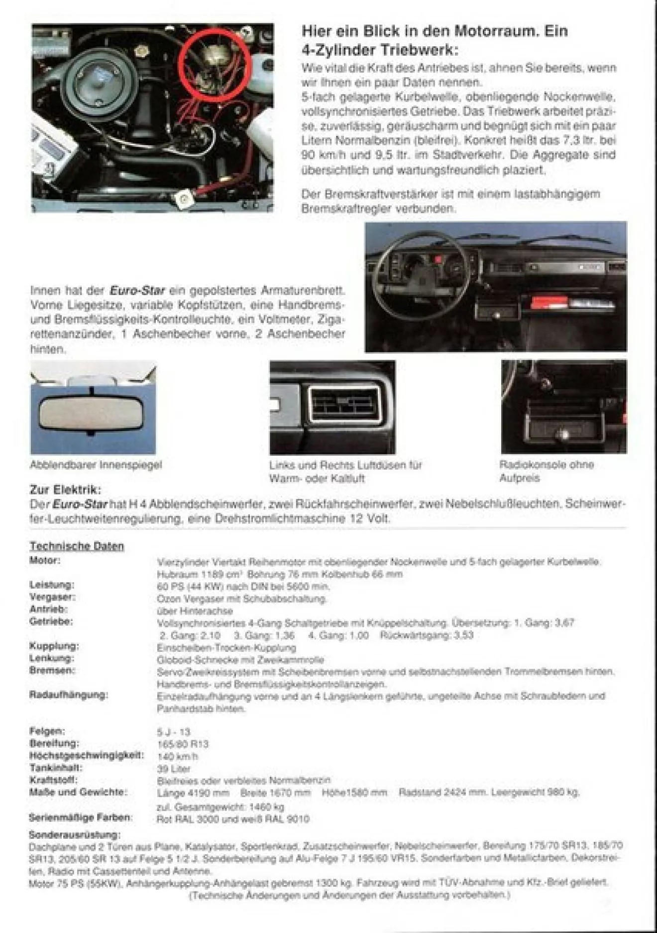 Под капотом был бензиновый мотор 1.2 литра (60 л.c) оснащённый карбюратором «Озон». Коробка передач привычная 5 ст. механика. Динамика автомобиля явно не спорткаровская, 16 секунд до отметки 100 км/ч. Максимальная скорость 120км/ч при снятой крыше, так как все-таки аэродинамика там отдыхала, в закрытом варианте можно было разогнаться до 140 км/ч.