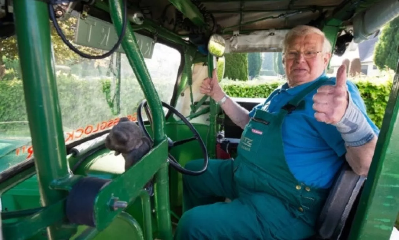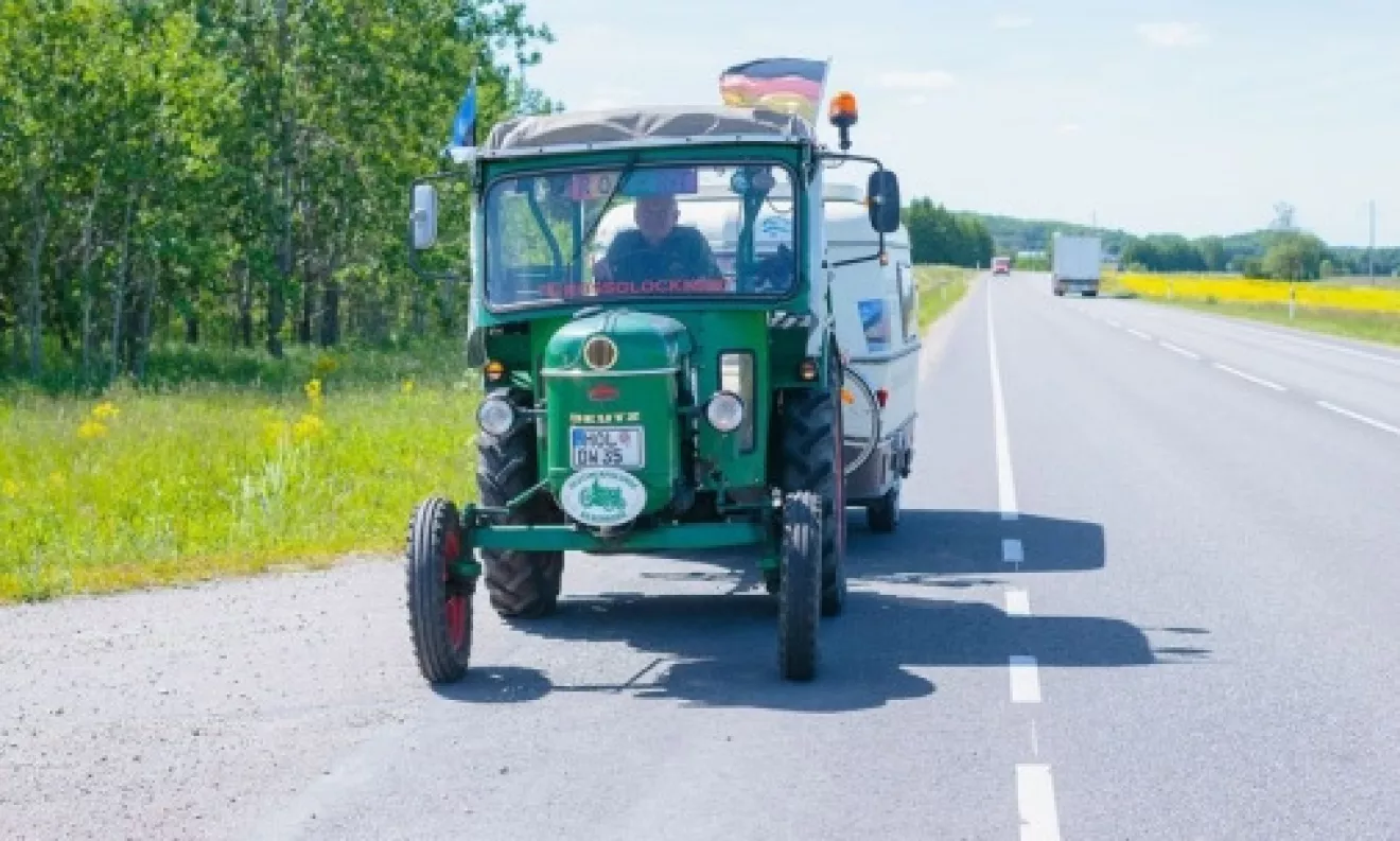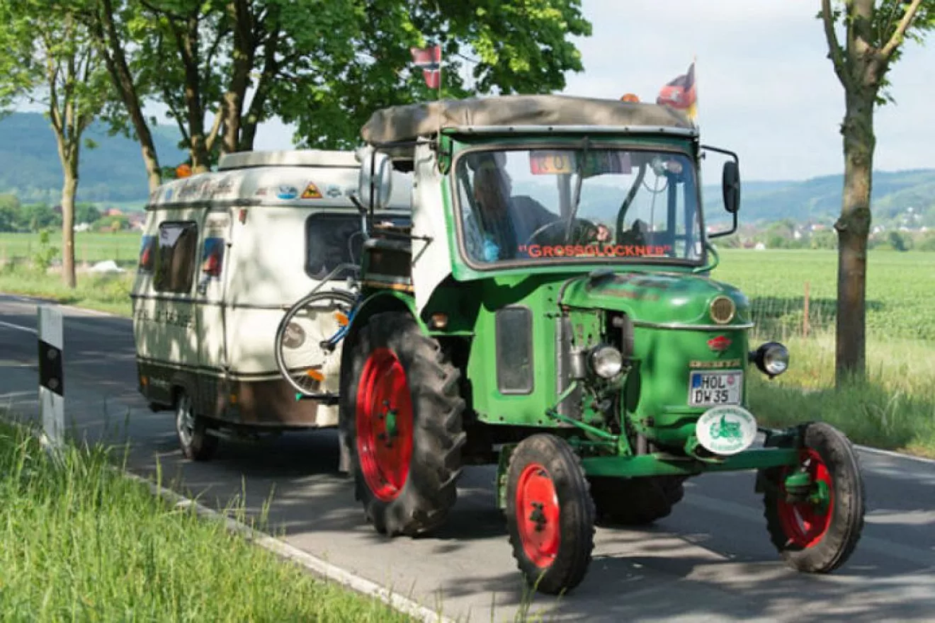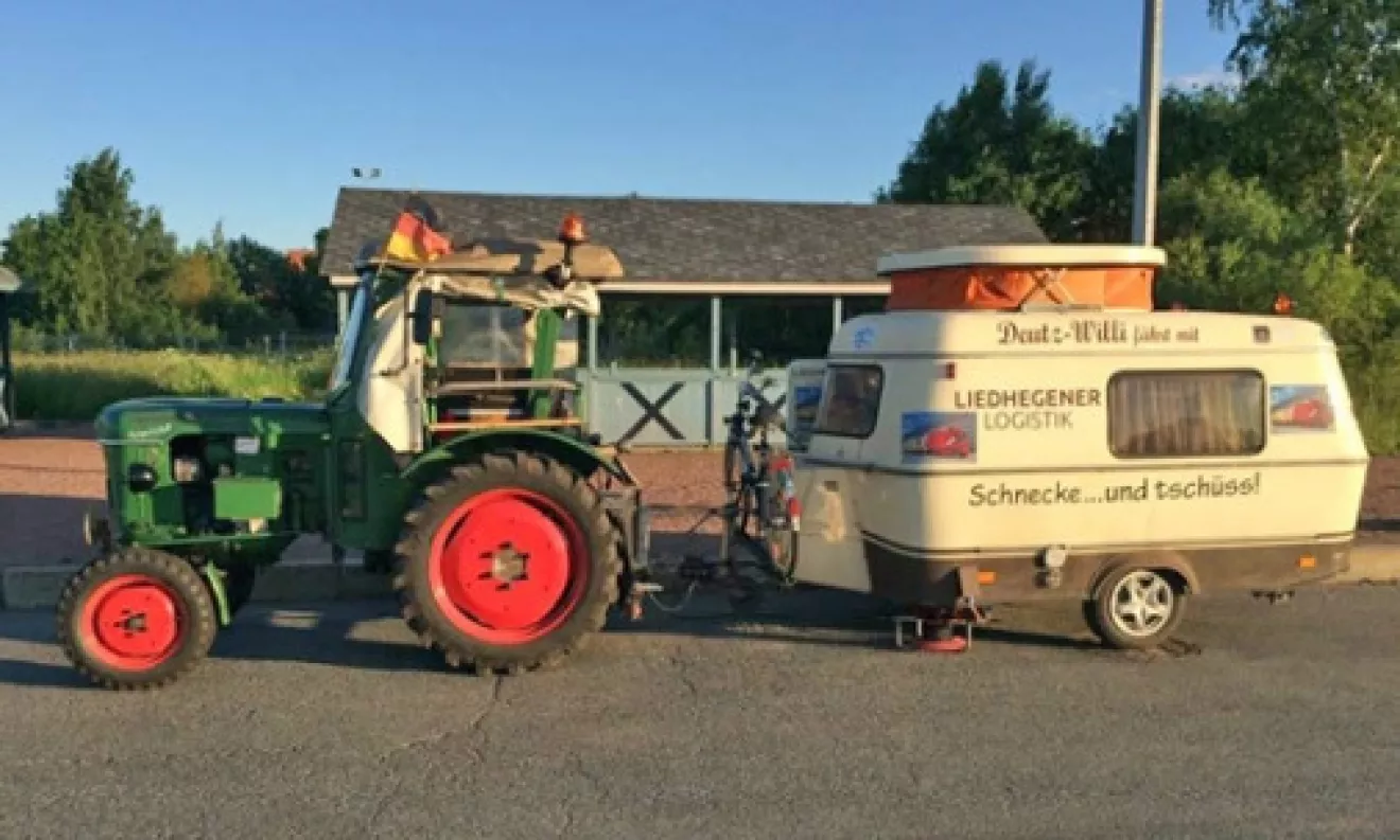 В течение месяца 81-летний пенсионер из Германии преодолевал на своем тракторе, к которому был прицеплен небольшой дом на колесах, по 120 километров в день. При максимальной скорости транспортного средства в 18 километров в час.
