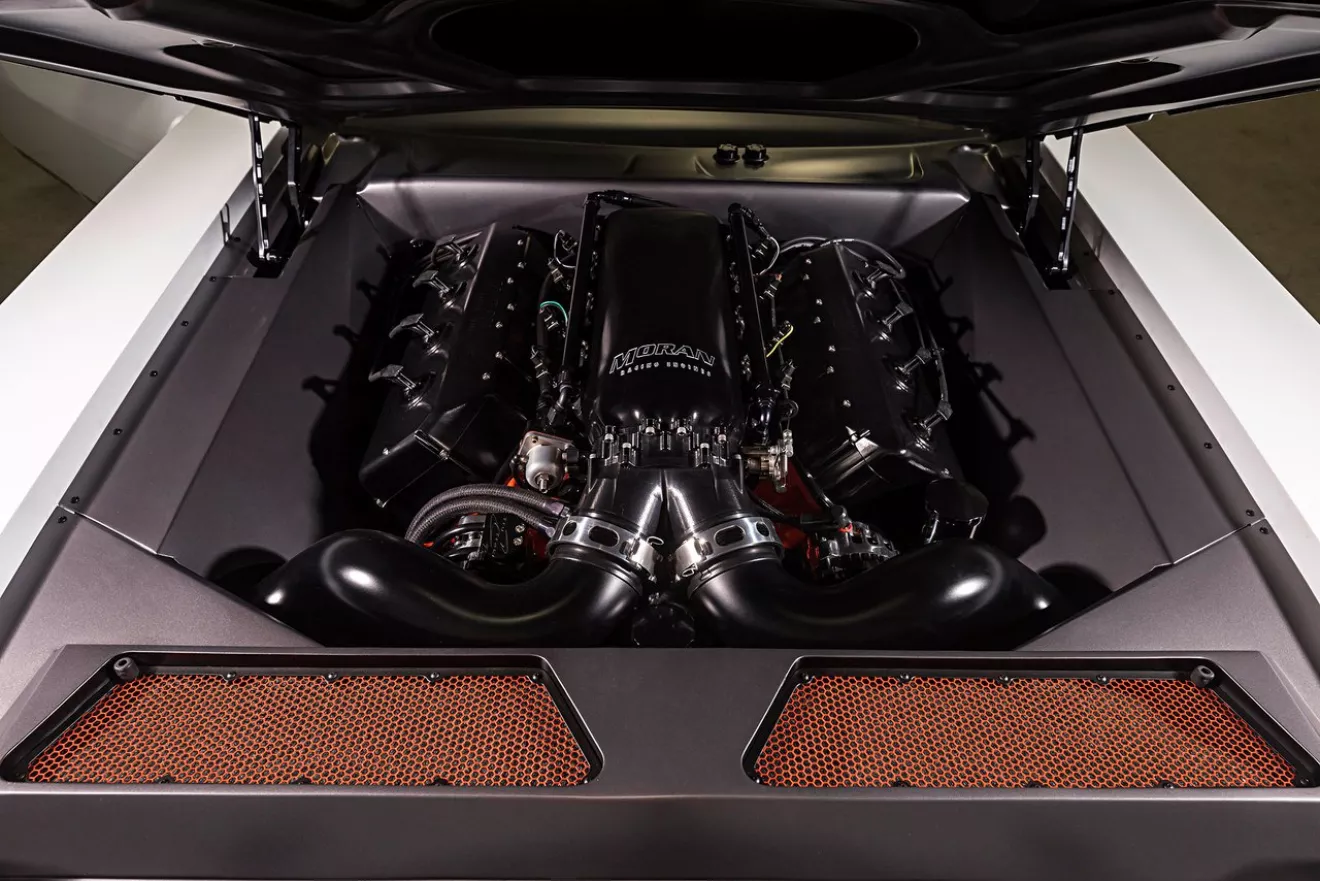 НУ И КОНЕЧНО ЖЕ, такой неординарной машине нужен неординарный мотор. За мотором обратились к Moran Motorsports. Которые производят 572 Hemi Mopar способный выдать 800лс и 1100+ н.м. крутящего с самого низу (еще раз — АЗАЗАЗА JDM). Помпа гидроусилителя и генератор продолжают крутиться благодаря системе Billet Specialties Tru Trac.Competition Fabrications произвили и установили кастомный вып. коллектор.