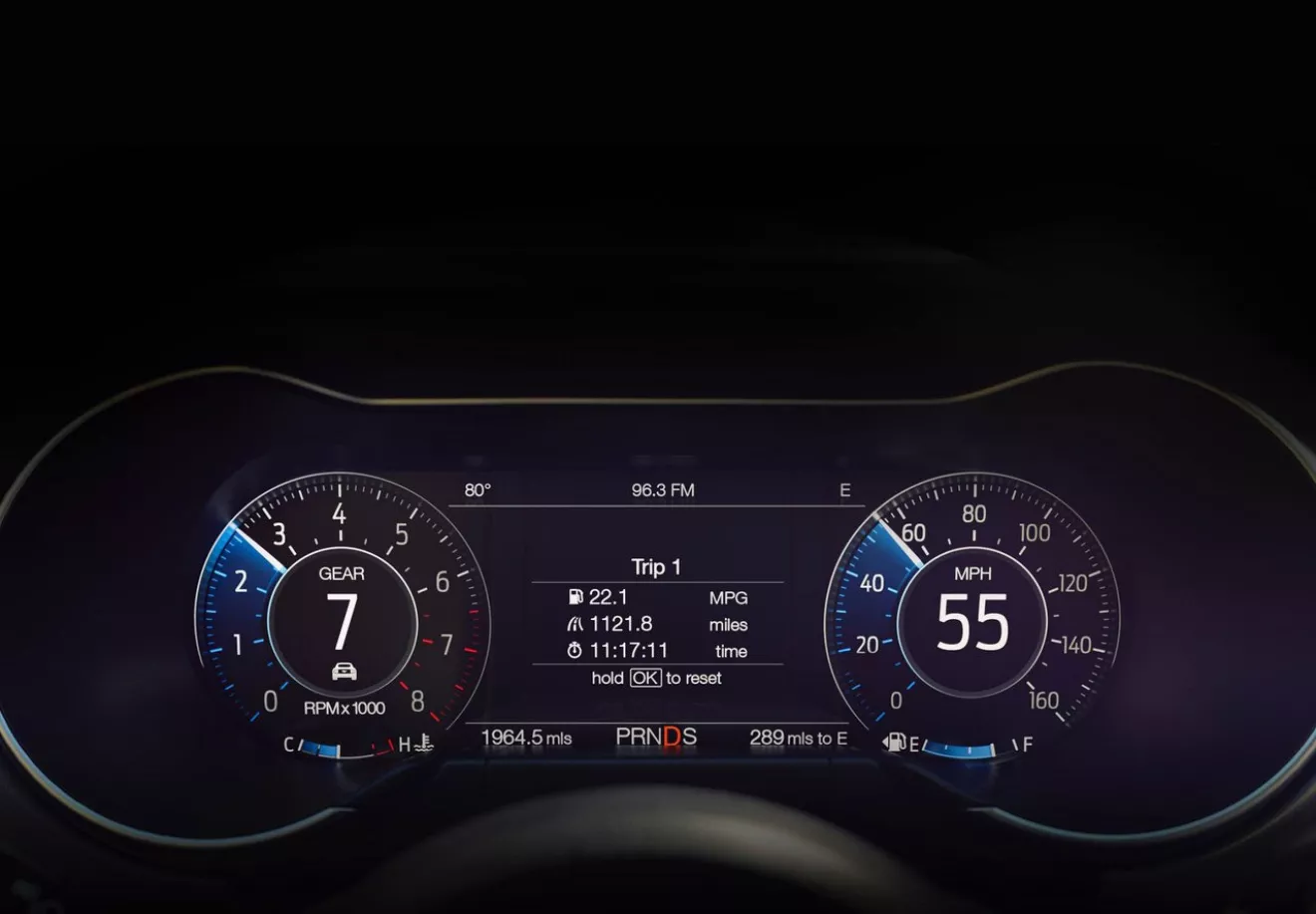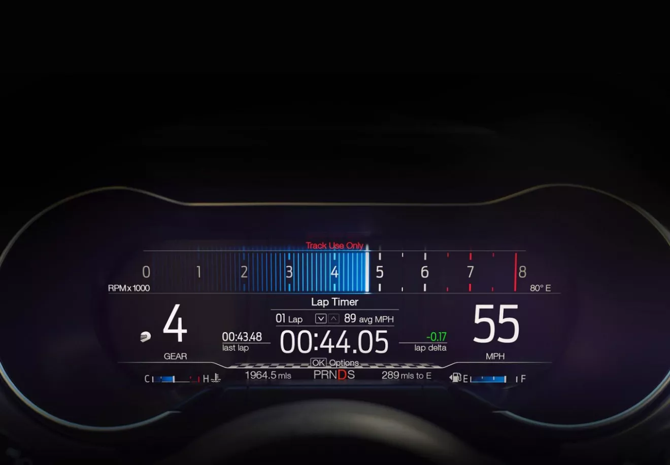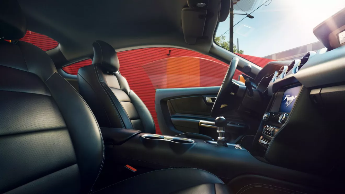 ▪В салоне может быть установлена настраиваемая 12-дюймовая полностью цифровая приборная панель. Однако в качестве стандарта предложены аналоговые приборы и датчики. Обновленный Mustang впервые получит подогрев рулевого колеса. Переработана отделка салона, центральная консоль была изготовлена вручную.