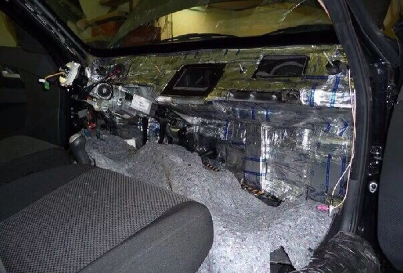 Следующим этапом наносим звукоизолирующий материал в два слоя на все части салона машины. После полной фиксации материала, необходимо проделать отверстия в отсеках вентиляции.