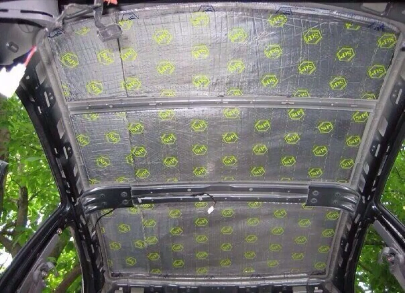 Крышу лучше всего обклеить вибропластом. При обработке потолка, стоит заклеить всю поверхность между поперечными.