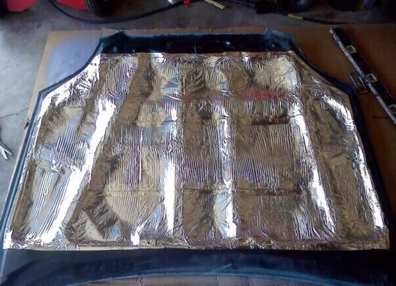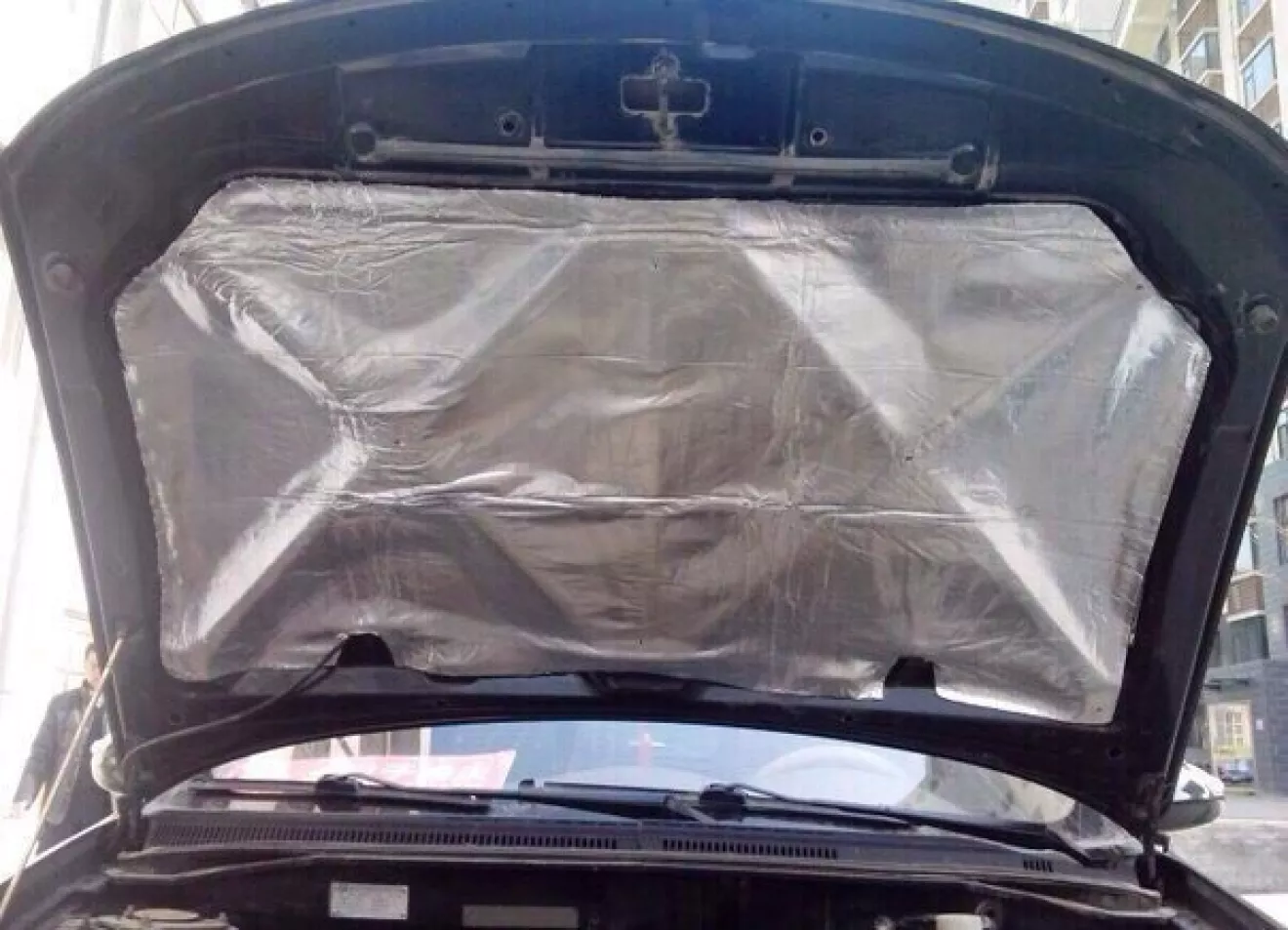 Начинать шумоизоляцию необходимо с моторного щита. Перед установкой материала стоит провести обработку поверхности. Обработка включает в себя обезжиривание специальным составом или простым ацетоном. Далее, наносим вибропласт в два слоя, предварительно подогрев его строительным феном.