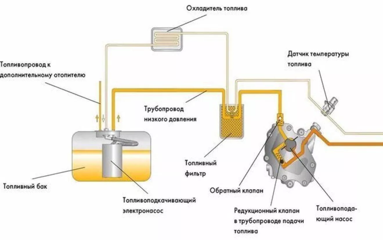 Топливо в системе циркулирует по топливопроводам. Различают подающий и сливной топливопроводы. В подающем топливопроводе поддерживается рабочее давление. По сливному топливопроводу излишки топлива удаляются в топливный бак.