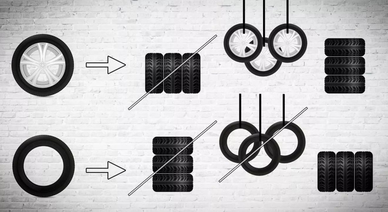 Если покрышки без дисков, то все наоборот. В этом случае их можно ставить вертикально. А вот подвешивать или класть их друг на друга не рекомендуется — покрышки могут деформироваться.