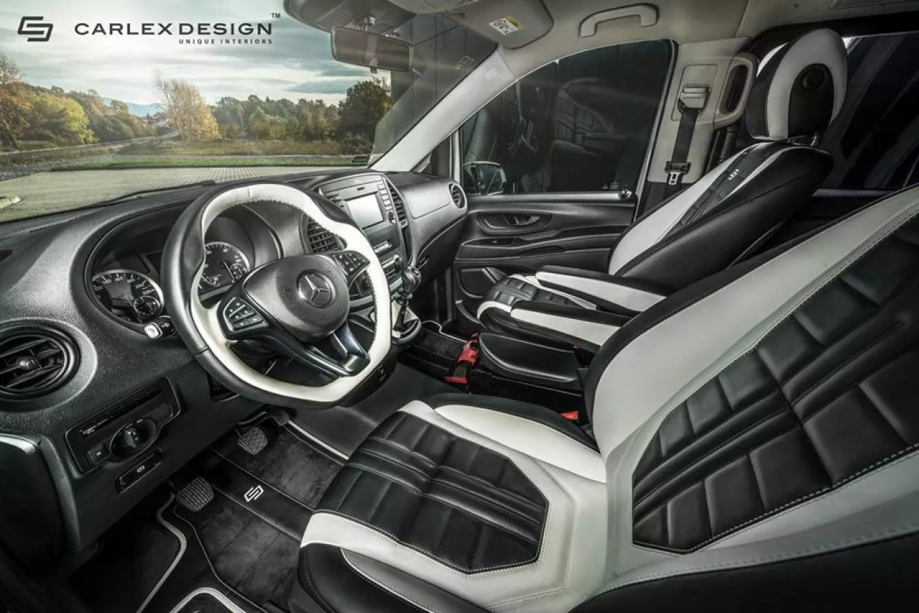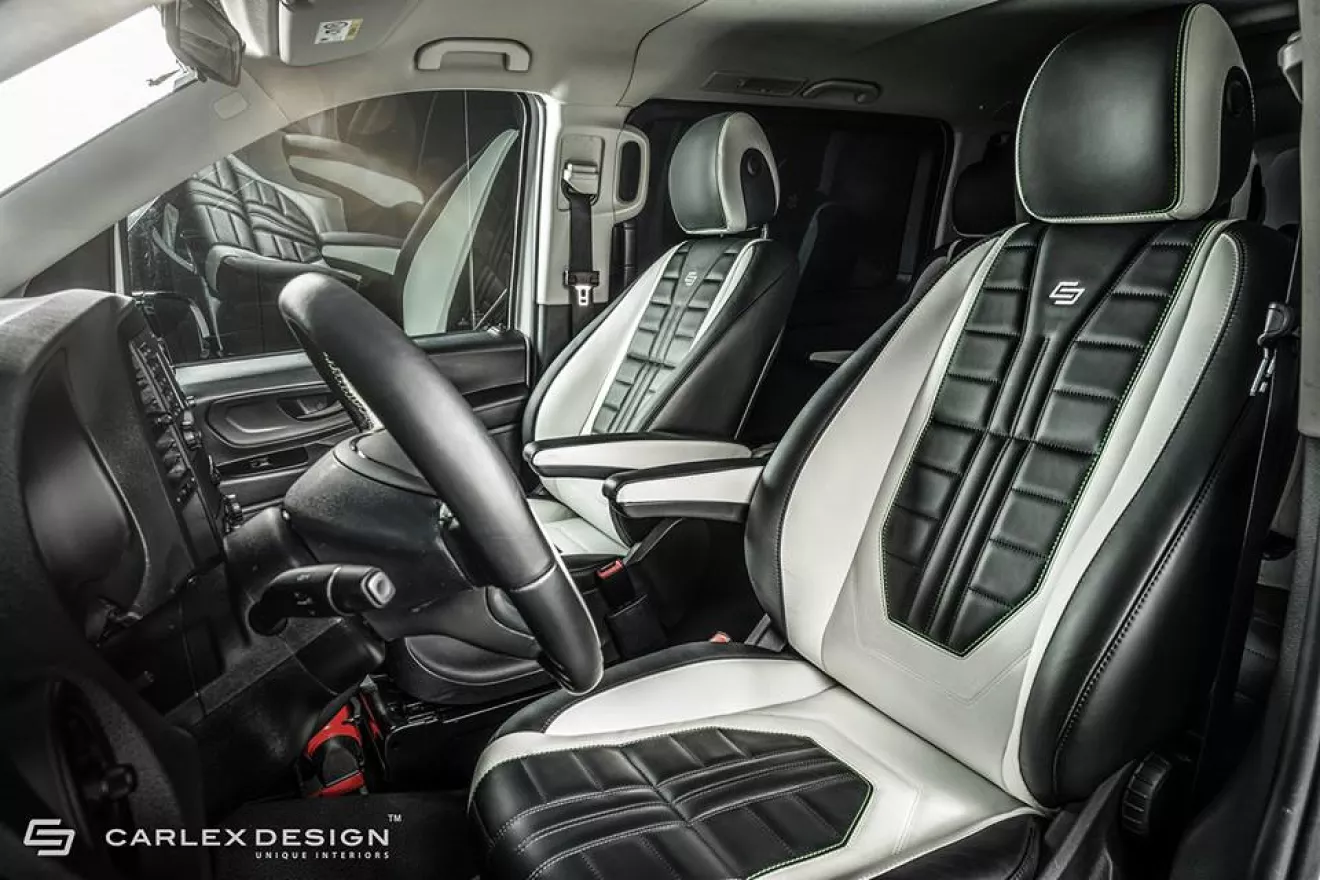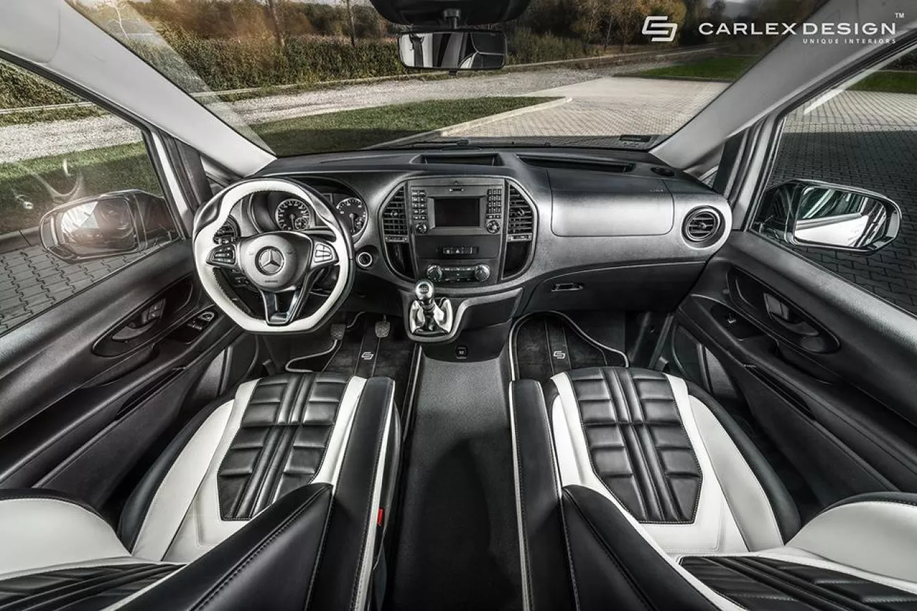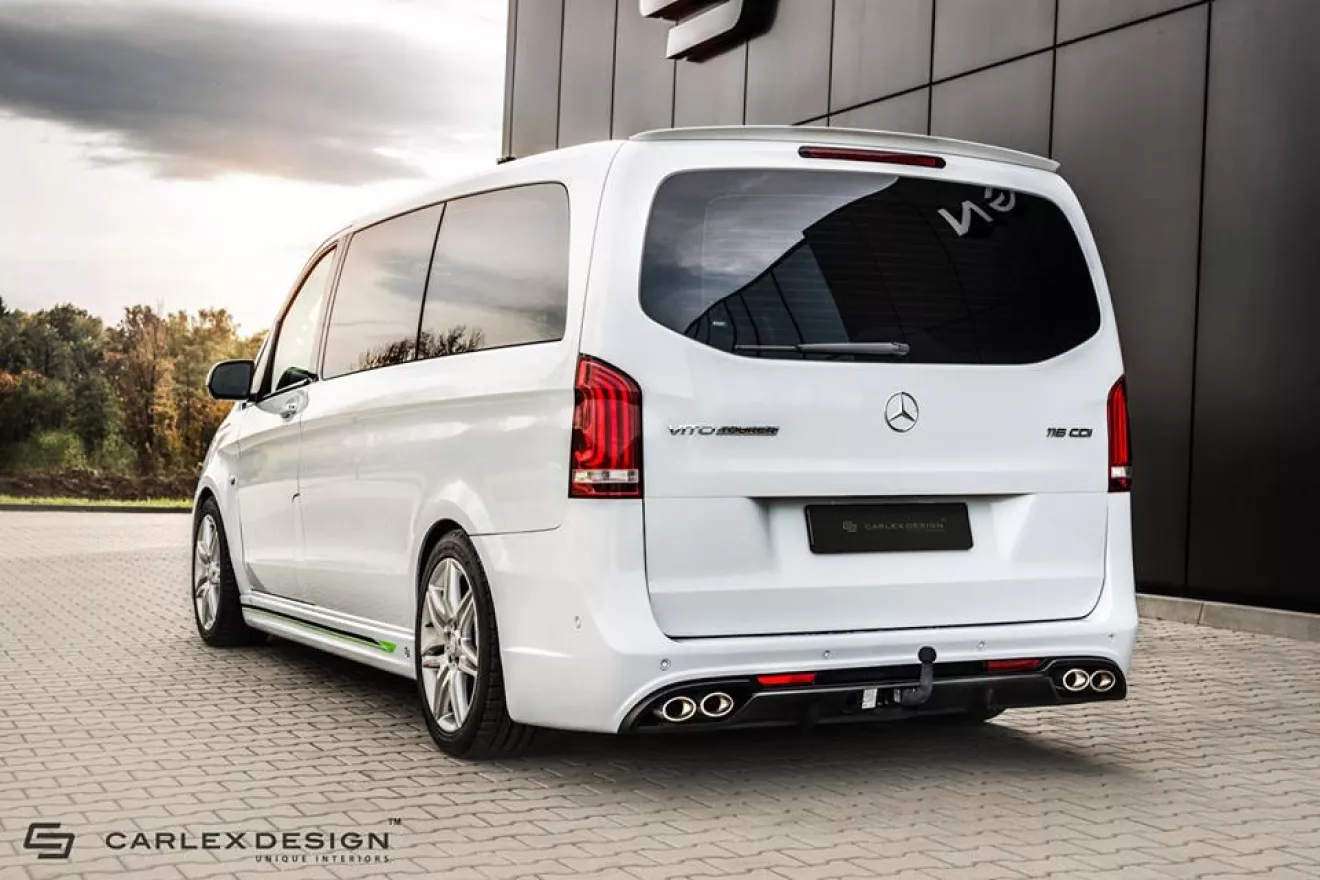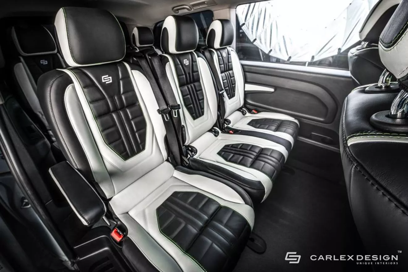 Mercedes-Benz Vito, после того как над ним поработали ребята из Carlex, стал больше похож на спорткар. Помогают ему в этом агрессивный обвес кузова с контрастными салатовыми вставками и графикой, спортивные шестиспицевые литые колеса серебристого цвета, гармонирующие с четырьмя небольшими патрубками выхлопной системы.Но, конечно, в чем действительно проявляется мастерство студии Carlex Design, это салон автомобиля и этот проект продолжает традицию. Салон пассажирского Mercedes-Benz Vito обили комбинацией черной и белой кожи высокого качества.