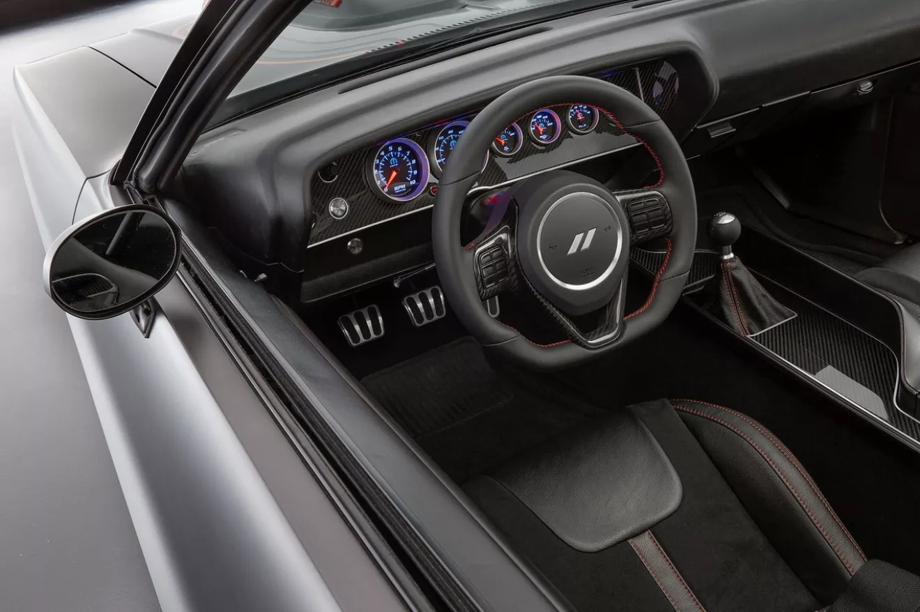 Ради чистоты линий удалены заправочный лючок (горловина — в багажнике), водостоки и наружные дверные ручки. Передняя панель с аутентичной архитектурой наполнена современными приборами, кресла и руль взяты от купе Dodge Viper, а рычаг переключения передач — у Challenger Hellcat.