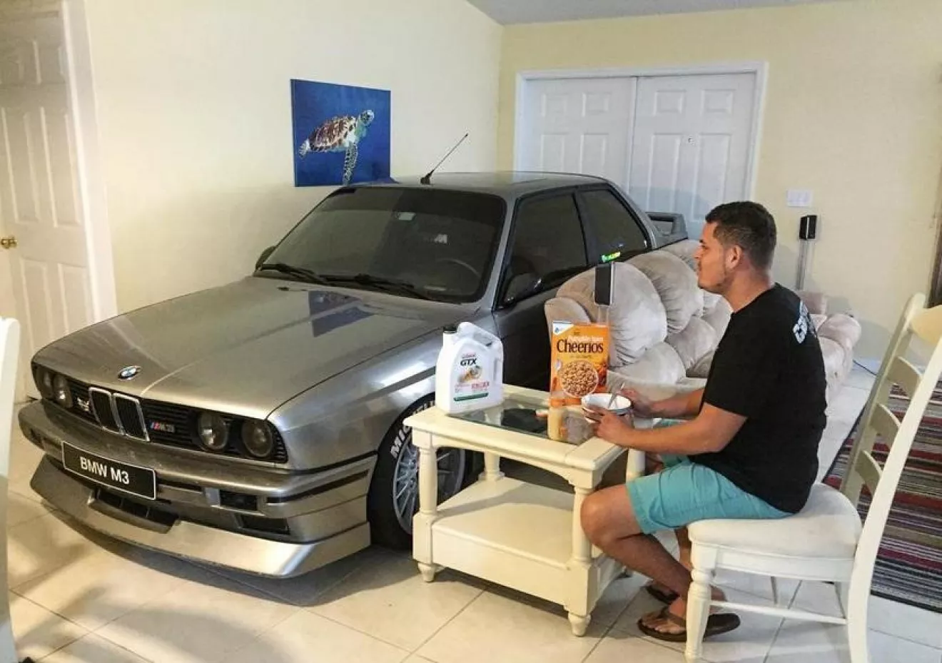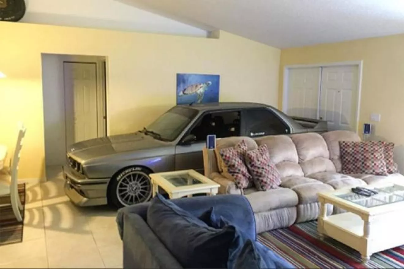 Сложные погодные условия заставляют жителей южных штатов прятать все самое ценное в доме – чтобы ураган его не разрушил. А житель Флориды Рэнди даже умудрился загнать в дом свое купе BMW M3.За неимением гаража американец припарковал свою БМВ прямо посреди гостиной. Удивительно, но купе даже протиснулось в двухстворчатую входную дверь и поместилось аккурат между диваном и столом. Рэнди устроил фотосессию с любимым авто и даже организовал подобие романтического ужина с овсяными хлопьями для себя и маслом для BMW M3. Как только погода улучшилась, тройка БМВ покинула дом.