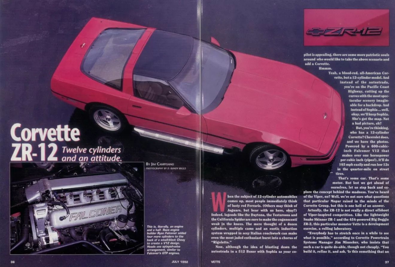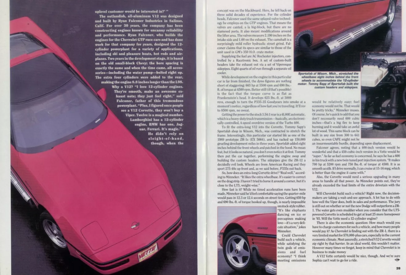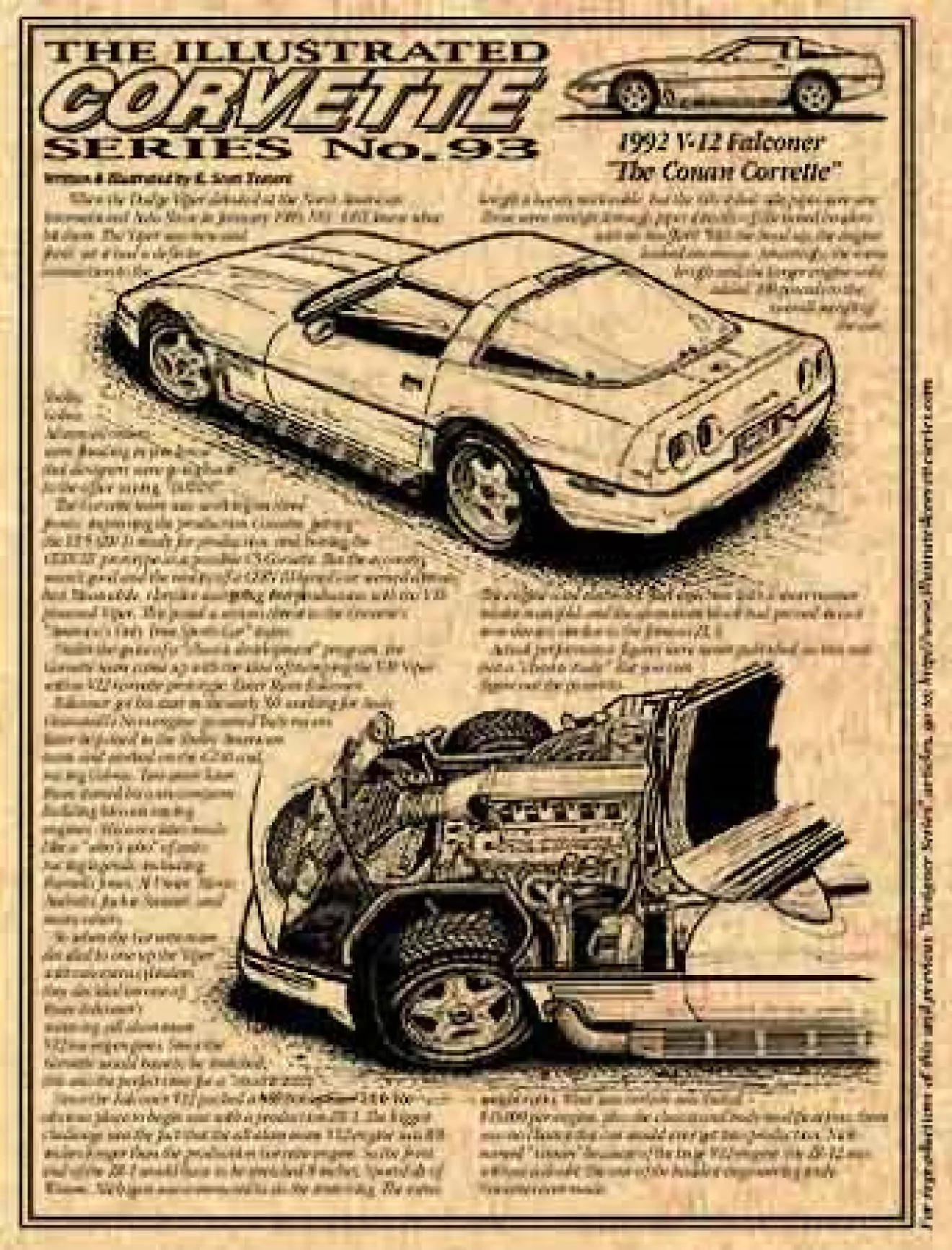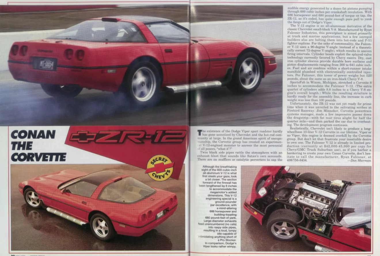 Или же "Конан Корвет" (по версии журнала Мотор Тренд). Этот прототип появился в начале 1990-х годов в качестве ответа GM на Dodge Viper. За основу был взят обычный ZR-1, однако поставить в него решили 12-цилиндровый двигатель. Им стал Falconer — судовой/авиационный двигатель с алюминиевым блоком, базой которого служил смолл блок от Шеви. Объём двигателя мог варьироваться от 400 до 600 кубических дюймов. Однако он был на 9 дюймов длиннее, чем стоковый LT5. Поэтому, чтобы впихнуть его в Корвет, пришлось удлинять переднюю часть, дорабатывать подвеску, ставить новые колёса и т.д.