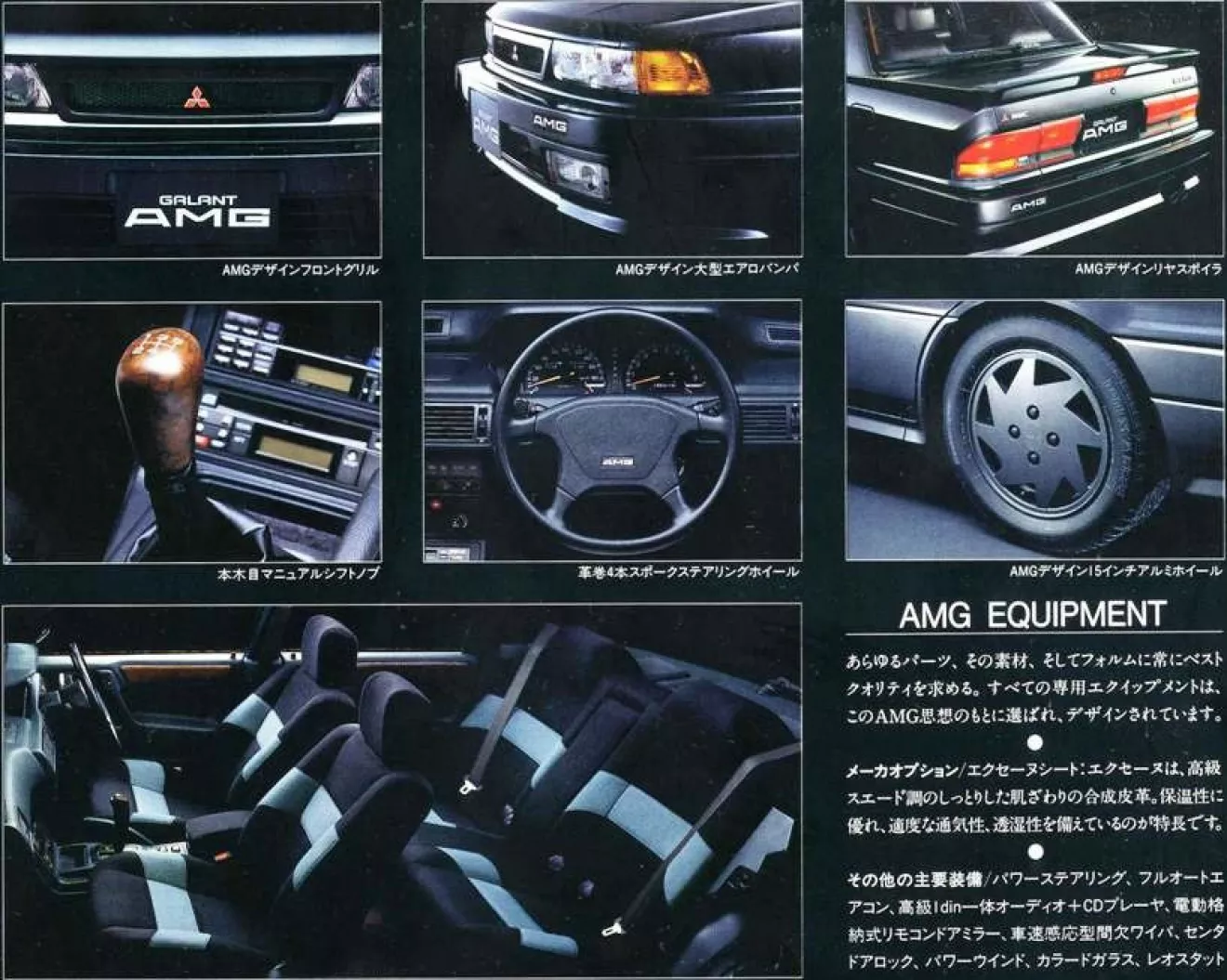Стандартное оборудование включает в себя эксклюзивную кожаную отделку, электрические стеклоподъемники, цифровой климат-контроль и CD-плеер (который является довольно впечатляющим на 1989 год!). Опционально Galant AMG оснащали деревом, который включает вставки в дверях, деревянную ручку переключения передач и руль Nardi.