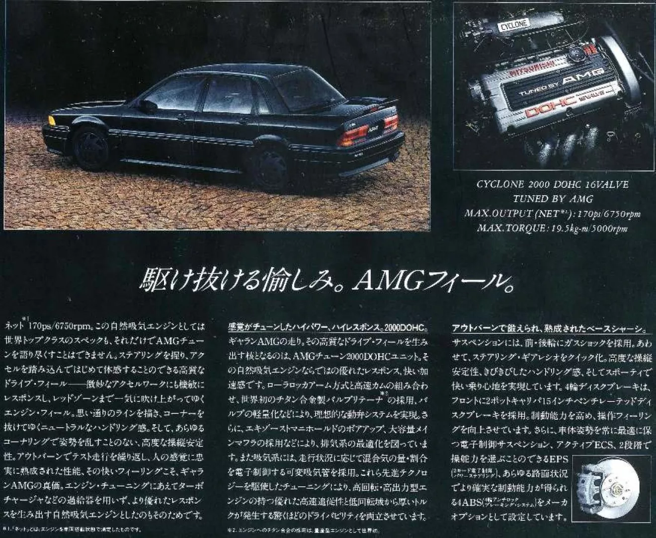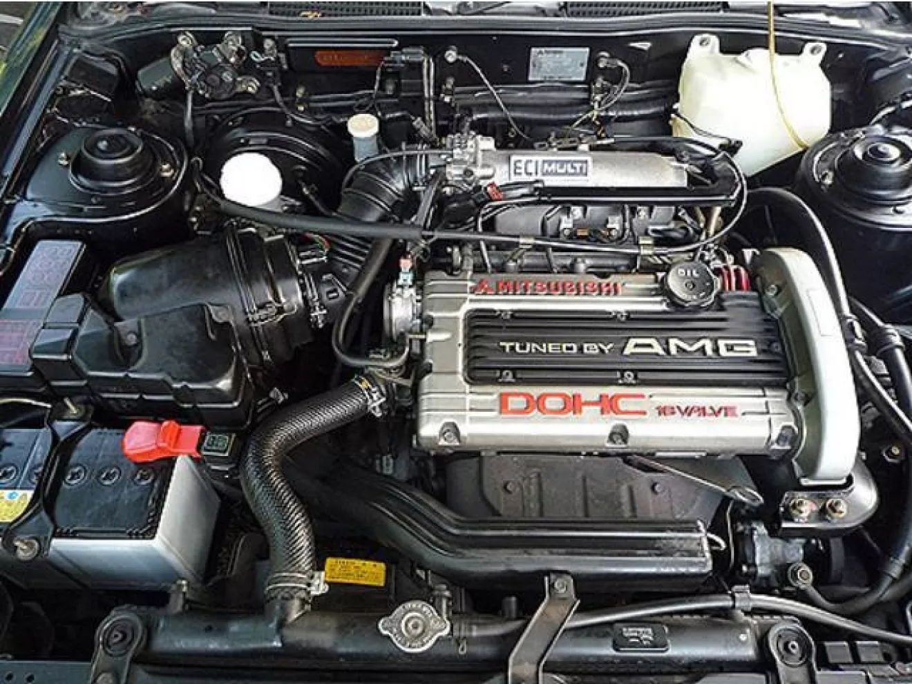 Под капотом находился легендарный 2-х литровый мотор 4G63, ставший в последствии сердцем каждого «Эвика», который, в трактовке AMG, получил новые распредвалы, поршни, титановые пружины клапанов, впускной коллектор изменяемой геометрии и спортивную выпускную систему. Все это дало 125кВт при 6750 об/мин и 191 Нм при 5000 об\мин. В результате степень сжатия повысилась до 10.4:1, и с двух литров рабочего объема удалось снять впечатляющие 170 лошадей. Двигатель обеспечивал отличный крутящий момент во всем диапазоне оборотов. На машине устанавливалась модернизированная 5-ступенчатая механическая или 4-х ступенчатая автоматическая КПП. Разгон до 100 км/ч — около 8.5 секунд.