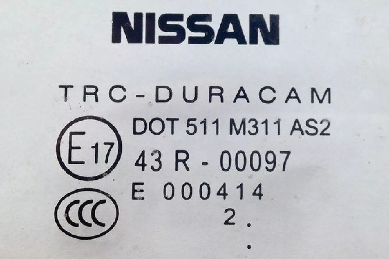 Этот вид маркировки содержит еще и индекс соответствия китайскому стандарту — ССС E000414. Дата производства проставлена почти по аналогии с предыдущим примером — август 2012 года. Вдобавок, кроме производителя стекла, TRC-DURACAM, в маркировке красуется и автомобильный бренд. В данном случае это дополнительный знак, что элемент оригинальный.
