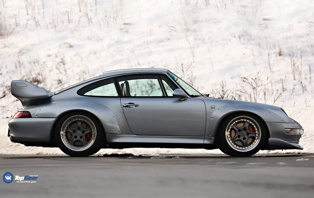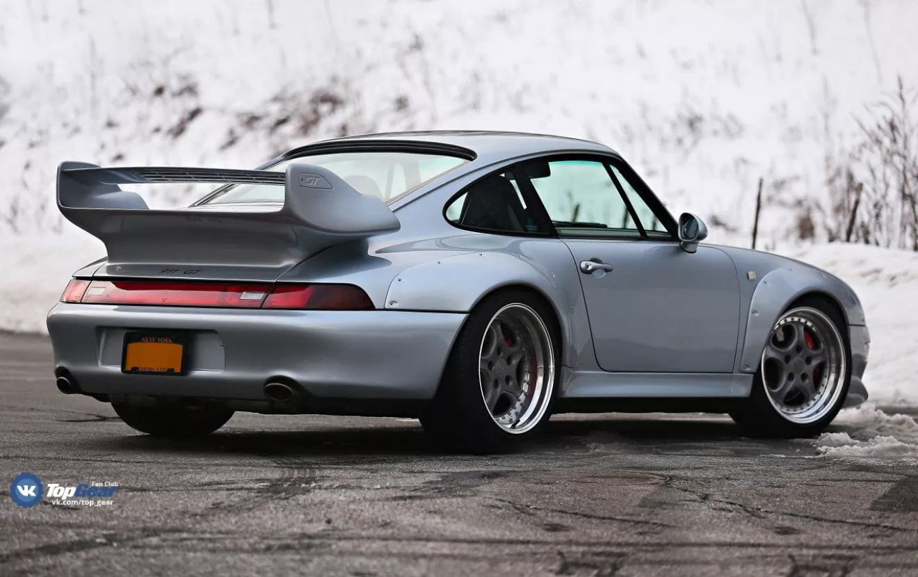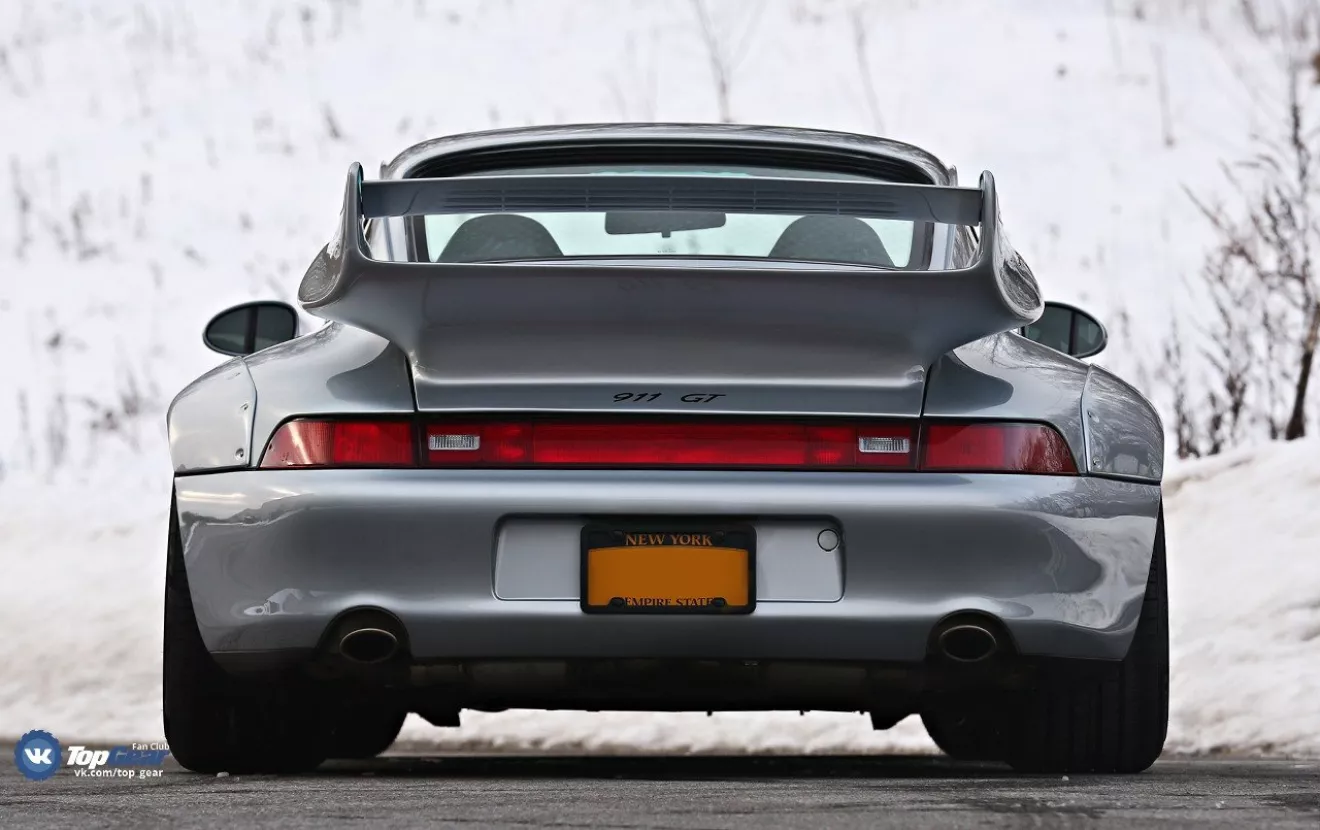 Двигатель: 3.6 В6 Мощность: 430 л.с. Крутящий Момент: 540 Нм Макс. скорость: 295 км / ч Разгон до Сотни: 4.4 сек Привод: Задний Масса: 1215 кг Без ПОСЛЕ отмены мирового Чемпионата гонок на выносливость (Чемпионат мира спорткаров) в 1992 году вскоре был учрежден новый — BPR Global GT Endurance Series, возродивший международные гонки класса GT, Для участия в нем Porsche подготовила свой болид и, согласно правилам омологации, 57 выпустила штук дорожных версий Porsche 993 GT2. Машина создана на базе полноприводного Turbo, но оставлен только задний. В мотор установлен дополнительный масляный радиатор для большего буста, способного выдать 430 л.с. Конечно же машина облегчена, в том числе алюминиевыми дверьми и крышкой багажника, а также сильно переработана аэродинамика. Новый обвес с агрессивными расширителями арок, плюс здоровенное регулируемое антикрыло с дополнительными воздухозаборниками.