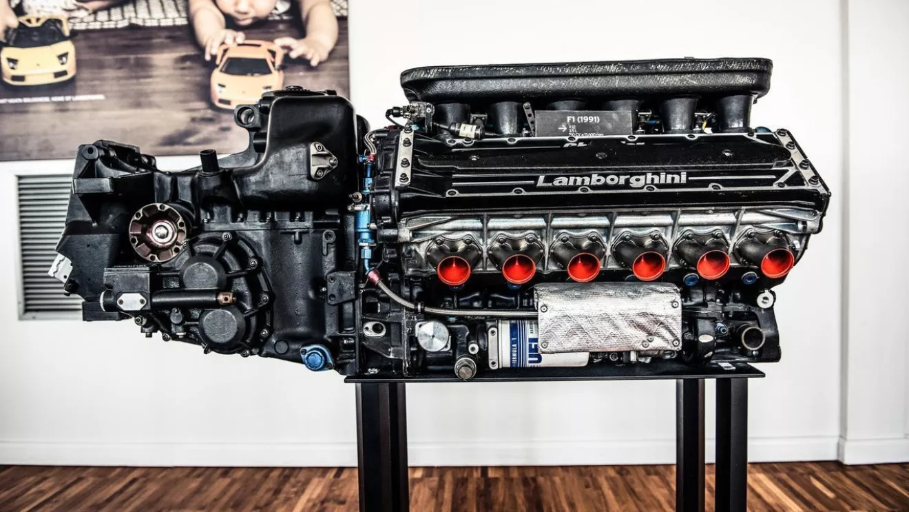 Вы, наверное, заметили, что это мотор. Огромный мотор. Это 3,5-литровый V12, который в 1991 году использовали в "Формуле-1". Да, все верно — в Ф-1. Когда в 1989-м турбонаддув был запрещен, Lamborghini решила покорить Королеву автоспорта ревом своего V12.