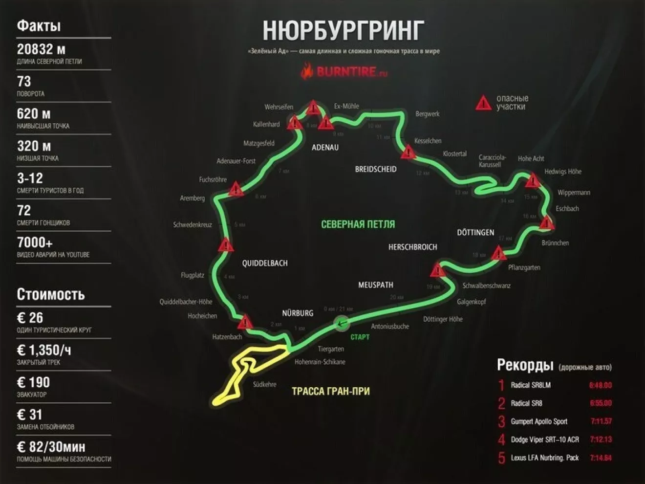 Нюрбургринг, Северная петля — самая длинная, сложная и популярная гоночная трасса в мире. Трек расположен в лесистой местности, ширина дорожного полотна всего 8-9 метров, практически отсутствуют гравийные ловушки, вместо которых в паре метров от асфальта красуются прочные отбойники с сеткой. За свою требовательность к навыкам вождения, получила название — Green Hell, что в переводе значит Зелёный Ад. Трасса пользуется популярностью не только у любителей погонять на своих авто, но так же среди автомобильных изданий и крупных автопроизводителей для проведения тестов. Любая новинка автомобильного мира, со спортивным уклоном, обязательно проходит здесь испытания, а рекорд прохождения трассы является ярким показателем возможностей авто и активно используется в рекламных целях.