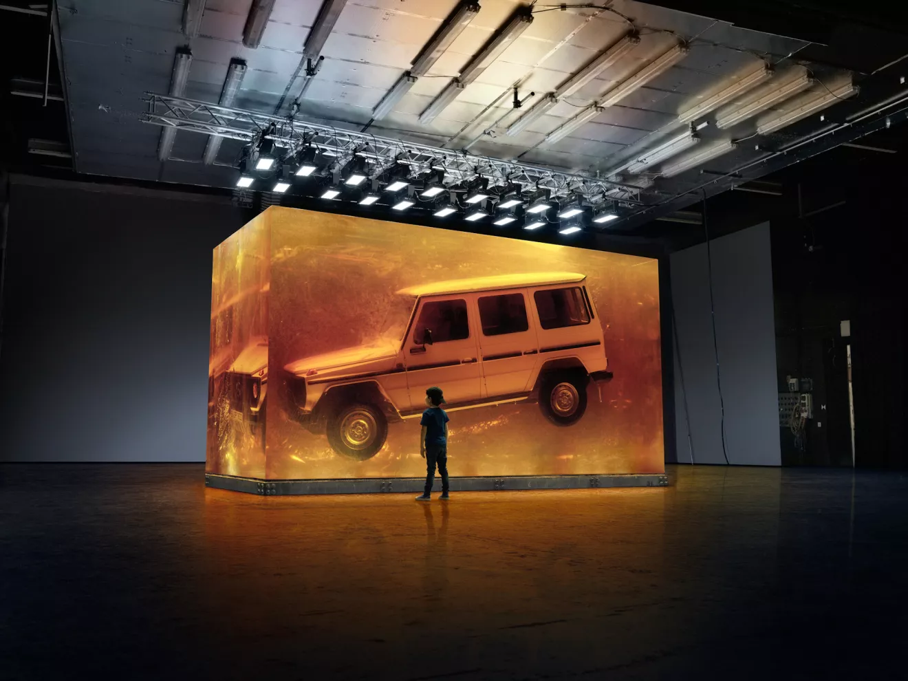На автошоу в Детройте, где пройдет премьера нового Mercedes G-Class, установили инсталляцию в виде куба из синтетической смолы, в которой находится Мерседес 280 GE 1979 года. Инсталляция символизирует неизменность ДНК этой модели. Машина в смоле напоминает насекомых застывших в янтаре.