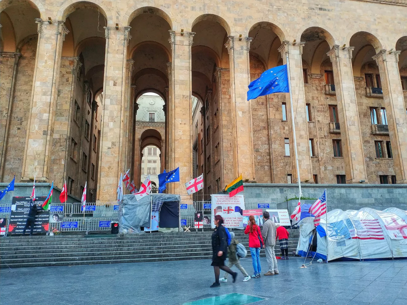 Возле дома правительства небольшой палаточный городок, живут протестующие. На плакатах что-то о Панкиси, там местные жители бунтуют против строительства микро-ГЭС. Недовольны, что их мнение не спросили, а начали строить станцию.