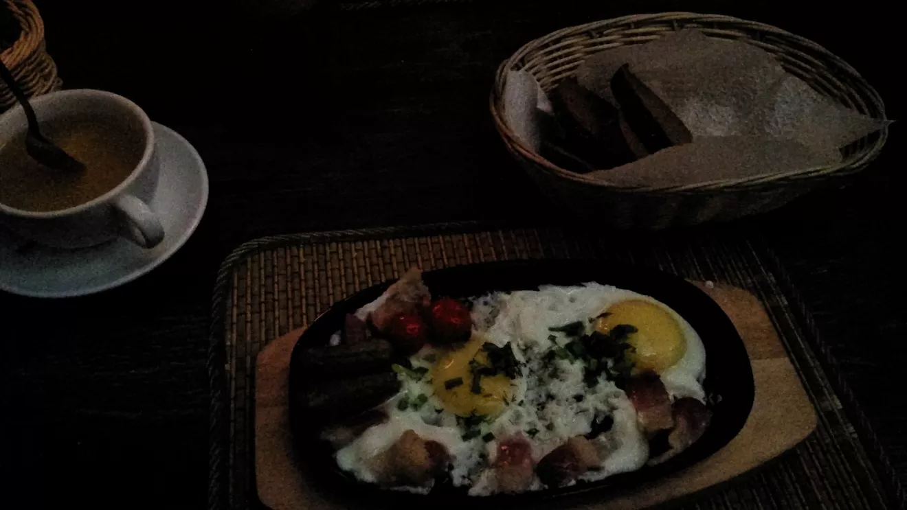 Завтрак весьма питательный, яичницу из двух яиц принесли на сковороде, шматы ветчины с салом, соленые огурчики и помидорчики дополняли блюда.