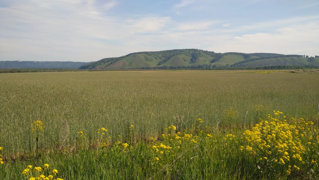 Совсем недалеко от трассы, на полянке, зажатой соседними невысокими горами. Горы там невысокие, лесистые.
