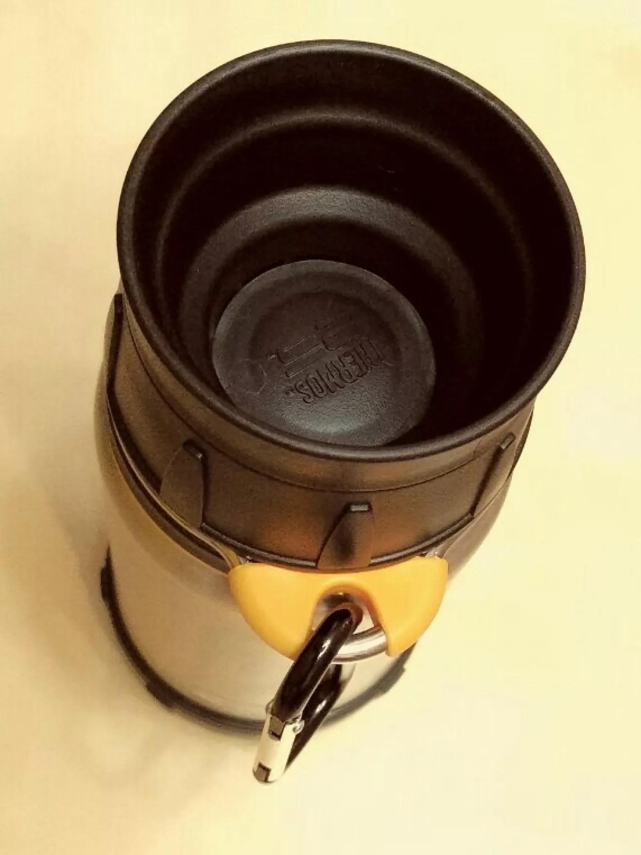Сбоку у него имеется карабинчик, удобно весить на пояс или на рюкзак снаружи, весит немного. Кружки как таковой на нем нет, пить можно из горлышка, необычная конструкция.