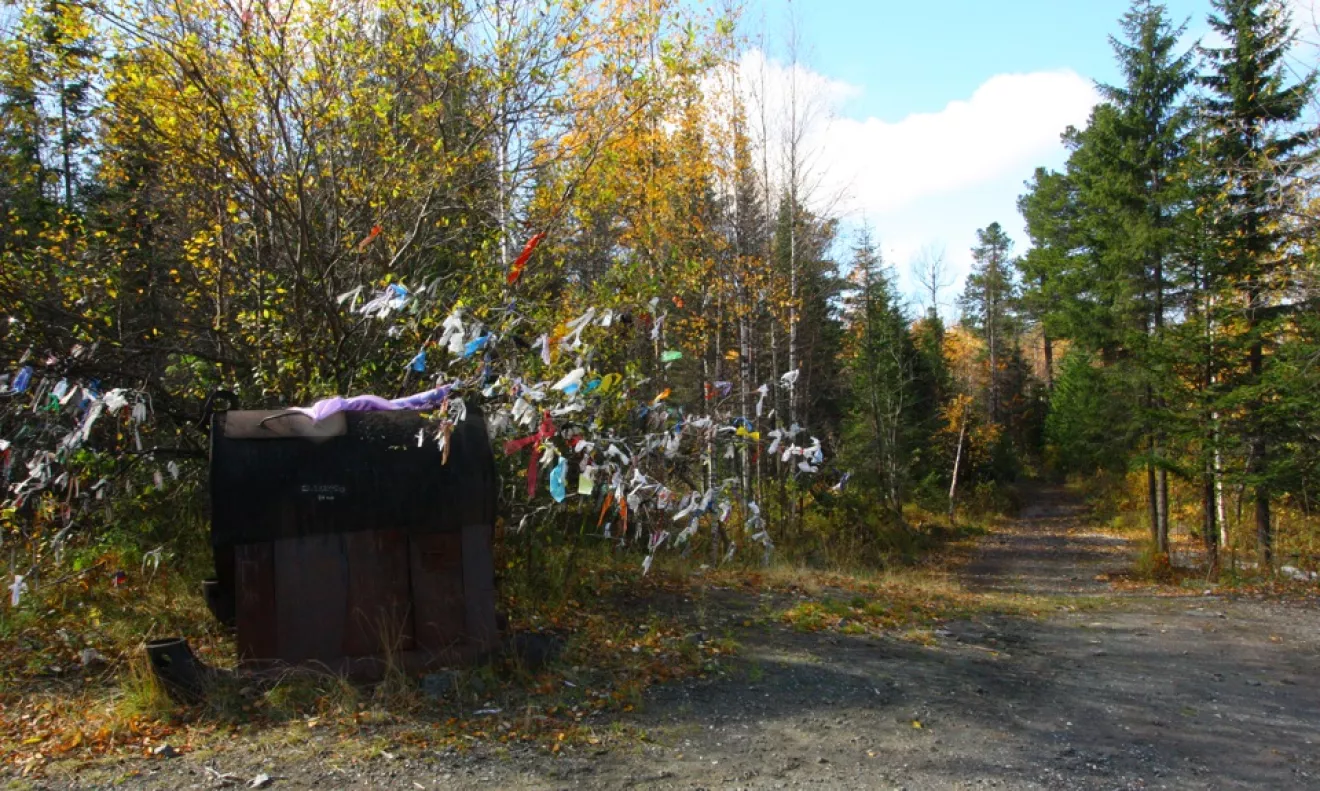 Примерно через 7 км от начала подъема увидели условный знак — дерево с ленточками.