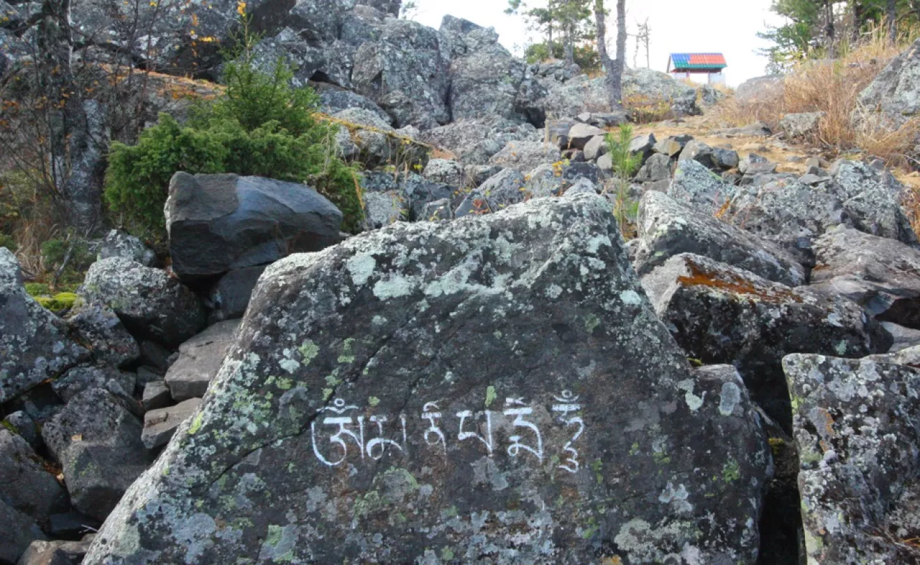 Последние метры надо было идти по камням на вершину. На одном из камней разглядел мантру.