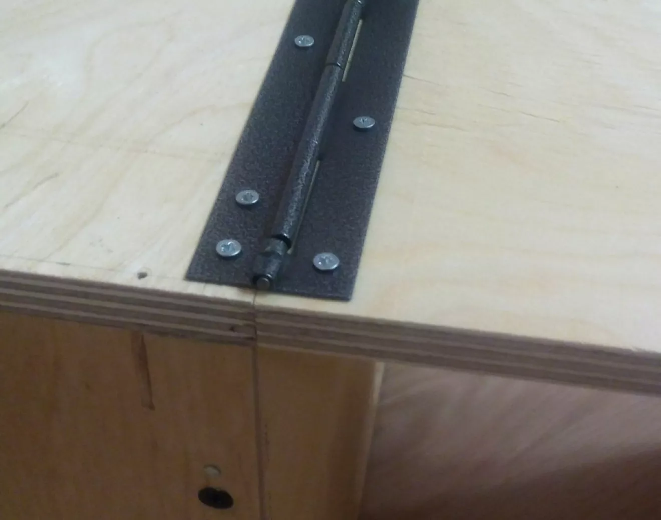 8. Рояльные петли нужной длины можно купить в строительном супермаркете, но стоят они там недешево. Например, петля длиной 120 см стоила около 400 рублей. Заехал в магазин для мебельщиков, торгующий разнообразной фурнитурой, купил петли по 35 рублей. Лишнее отрезал болгаркой.