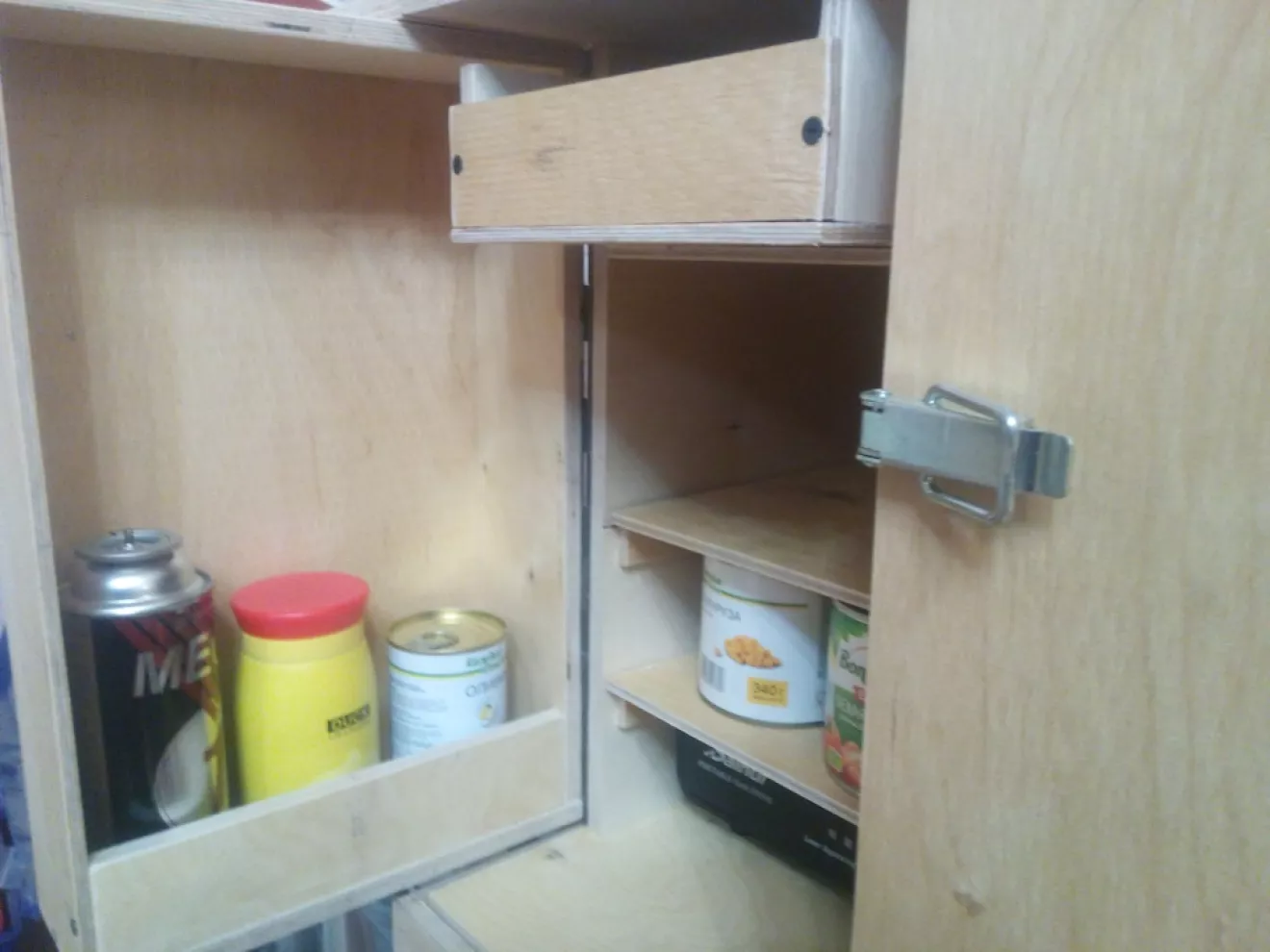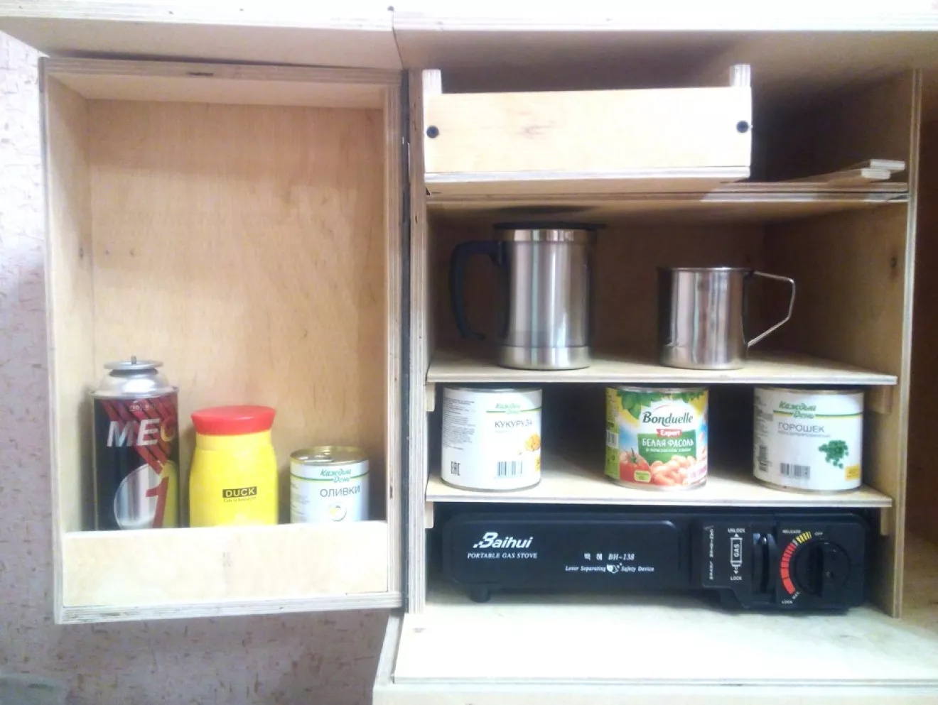 Туда можно будет разместить бутылки, баллончики для газплиты. Необходимо продумать крепление стоячих предметов, чтобы исключить их опрокидывание.