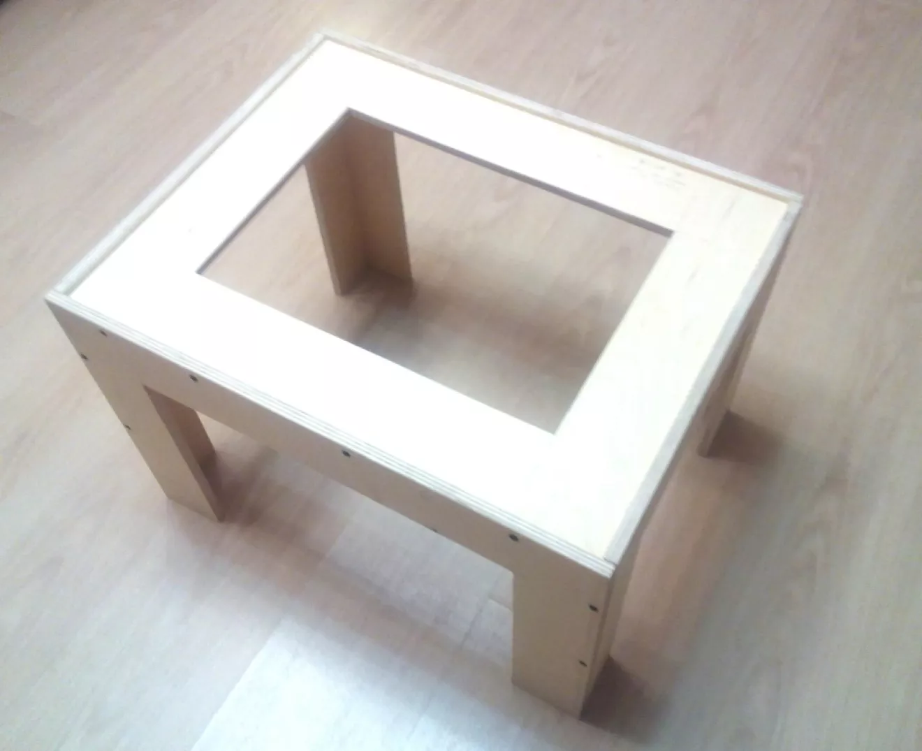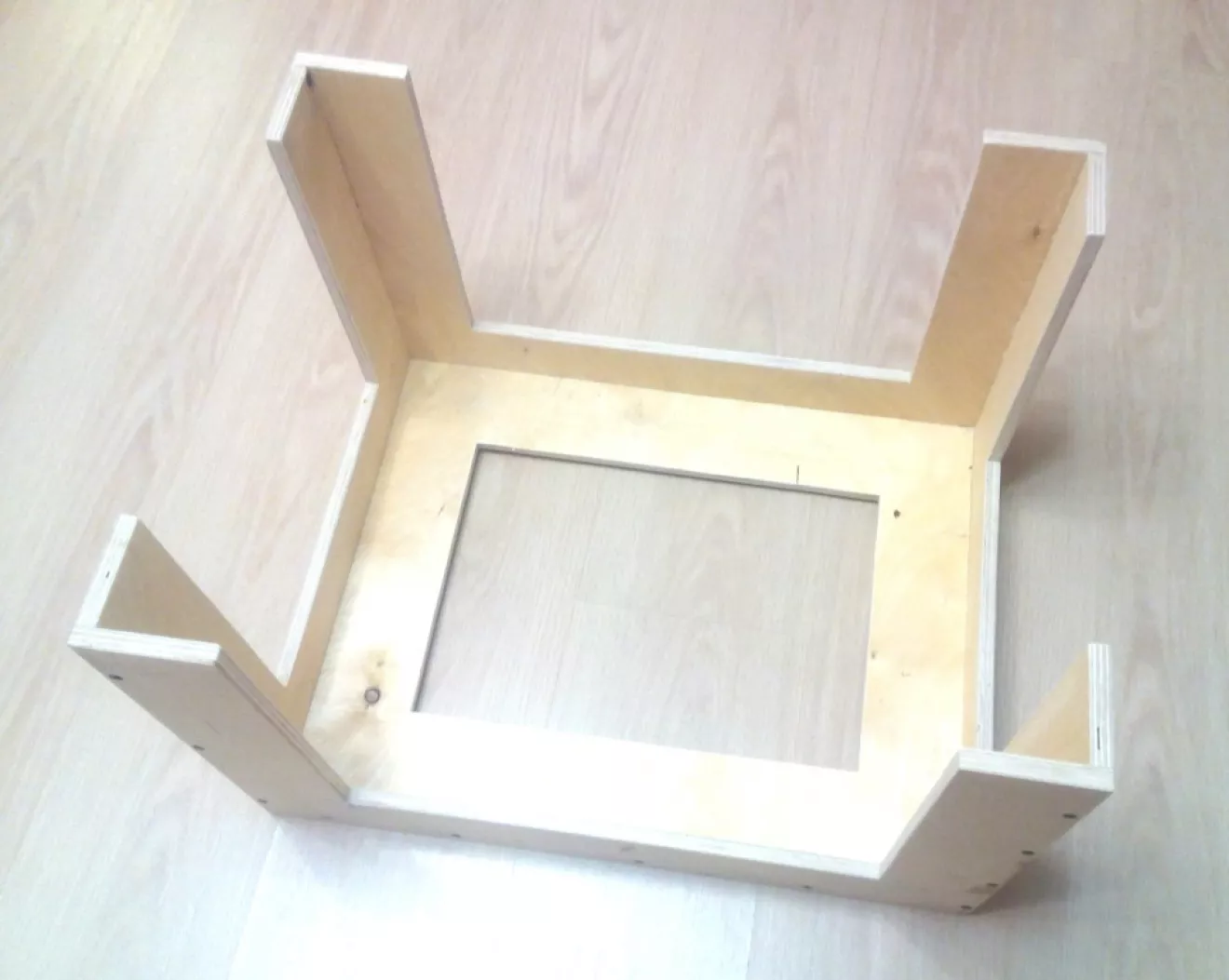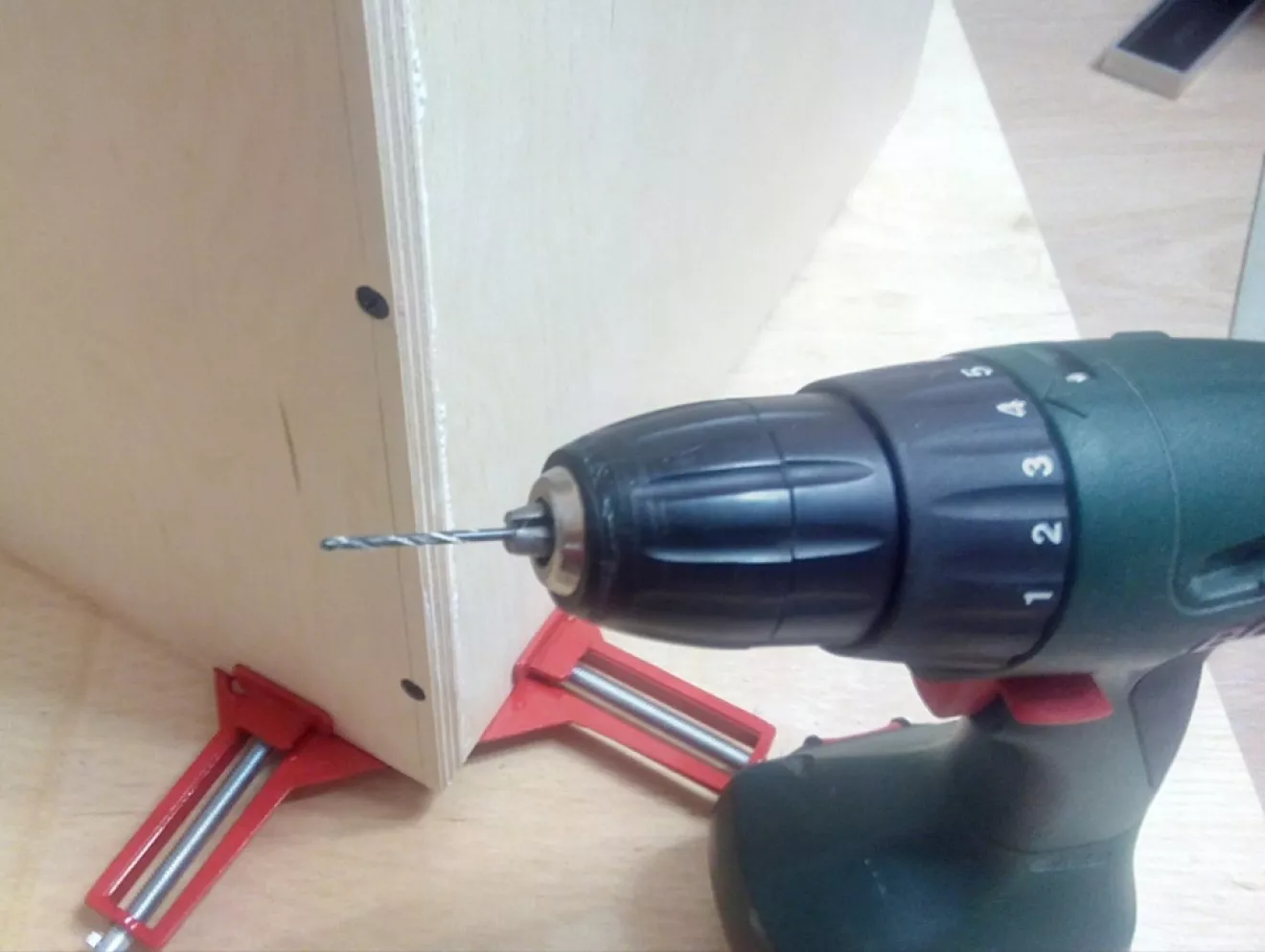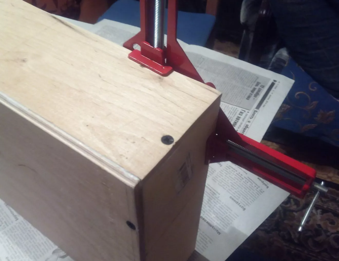 6. Процесс сборки достаточно простой. Сначала вычерчиваем линию, отступая от края на 6 мм. На этой линии будут находиться отверстия для саморезов, это середина толщины фанеры. Далее струбцинами соединяем 2 части для сборки, выравниваем углы и плоскости.