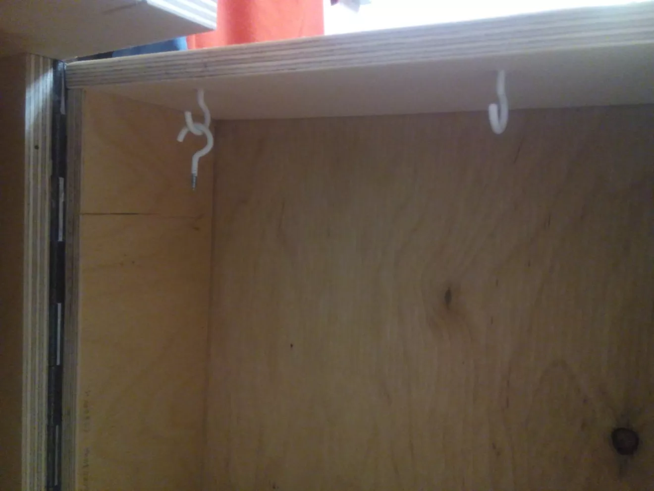 13. В верхнюю плоскость створки изнутри вкручиваем крючки. На них можно будет вешать полотенце, поварешку, нож.