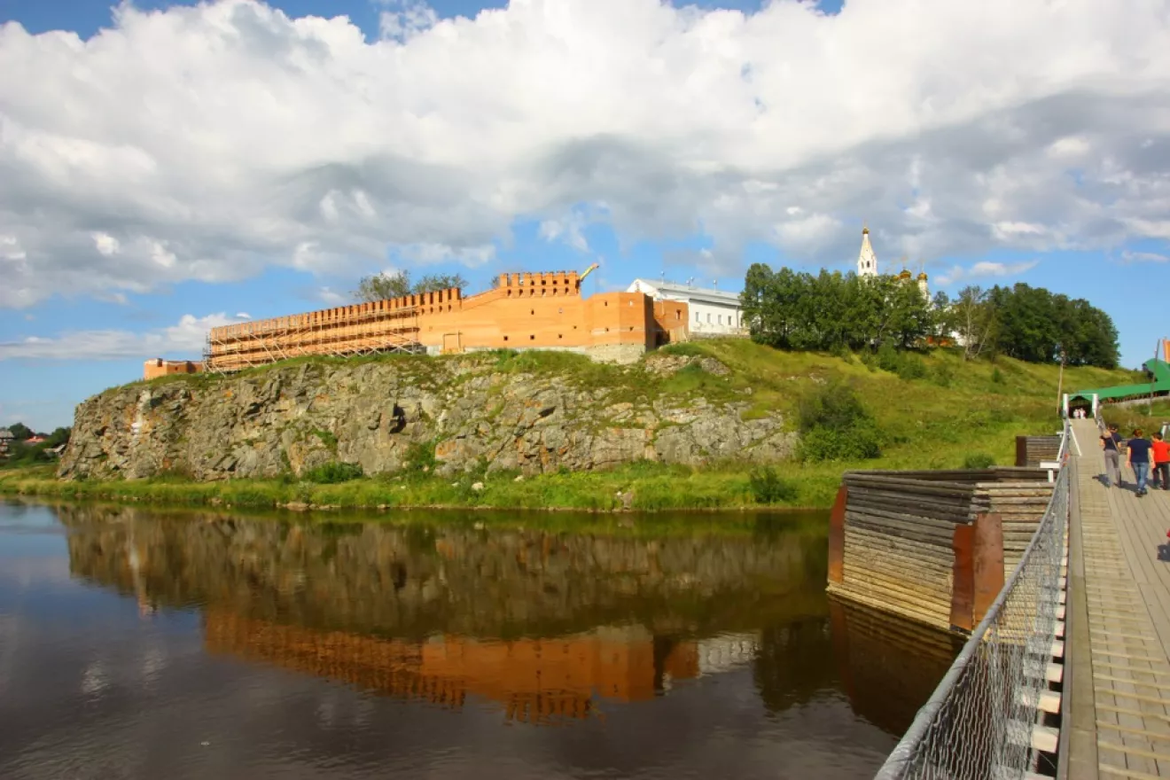 Прошлись по центру городка в поисках фастфуден. Был найден лишь сомнительный ларек с шаурмой, решили с питанием повременить. Кафешки были закрыты на спецобслуживание. Ничего не поделать, август — свадебная пора. Спустились к реке и прогулялись по пешеходному мостику через реку Туру, посмотреть на высокий каменный берег.