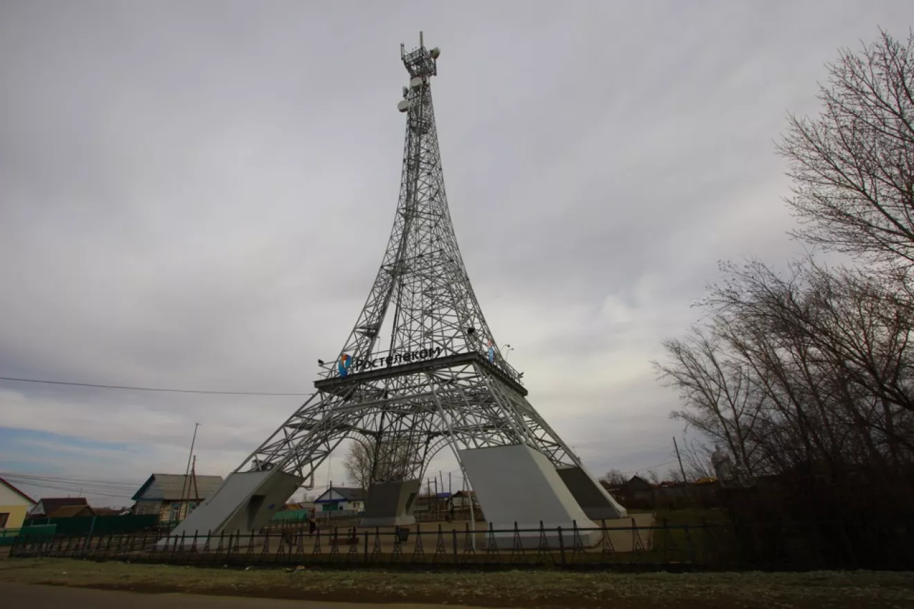 Выехали, до Парижа оставалось около 30 км. Дорога ушатана и раздолбана, ехать нужно аккуратнее. Уже на подъезде к поселку виднеется копия Эйфелевой башни. Так Уралсвязьинформ в 2005 году решил прокачать это место, установив вышку сотовой связи в такой форме.