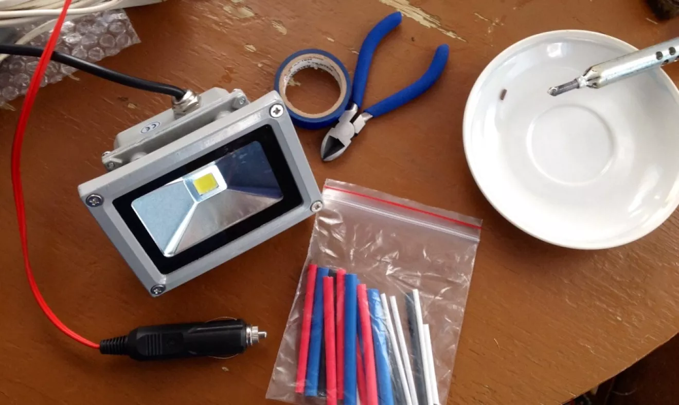 Откопал недавно заброшенную в гараже конструкцию, которую использовал при ночевках на природе. Она состояла из розетки в прикуриватель, нескольких метров провода и патрона с лампой на 40 Ватт и 12 вольт. Все бы хорошо, но светила она достаточно тускло при большом потреблении. Изготовлена она была лет 10 назад, решил ее обновить в духе современных технологий.